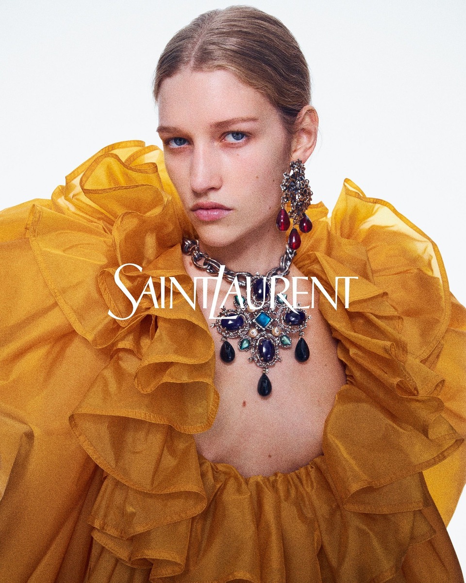 목걸이 역시 빠질 수 없죠. 생로랑은 박물관의 유명 문화재로 지정되어도 손색 없을 정도로 화려하고 존재감이 넘치는 네크리스와 이어링의 조합을 보여주었으며 베르사체는 허리선을 넘기는 긴 길이에 에스닉한 분위기를 지닌 목걸이를 선보였습니다.
