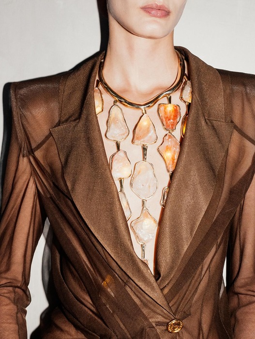 독특한 모양과 광채를 지닌 스키아파렐리의 이 목걸이는 건강에 관심이 많은 부모님을 둔 집이라면 하나쯤 갖고 있을 수도 있는 오브제에서 영감을 받았다고 합니다. 바로 ‘소금 램프’인데요, 실제 히말라야 소금 결정에 작은 홈을 파 그 안에 LED 전구를 넣고 빛이 들어 오도록 제작했습니다.