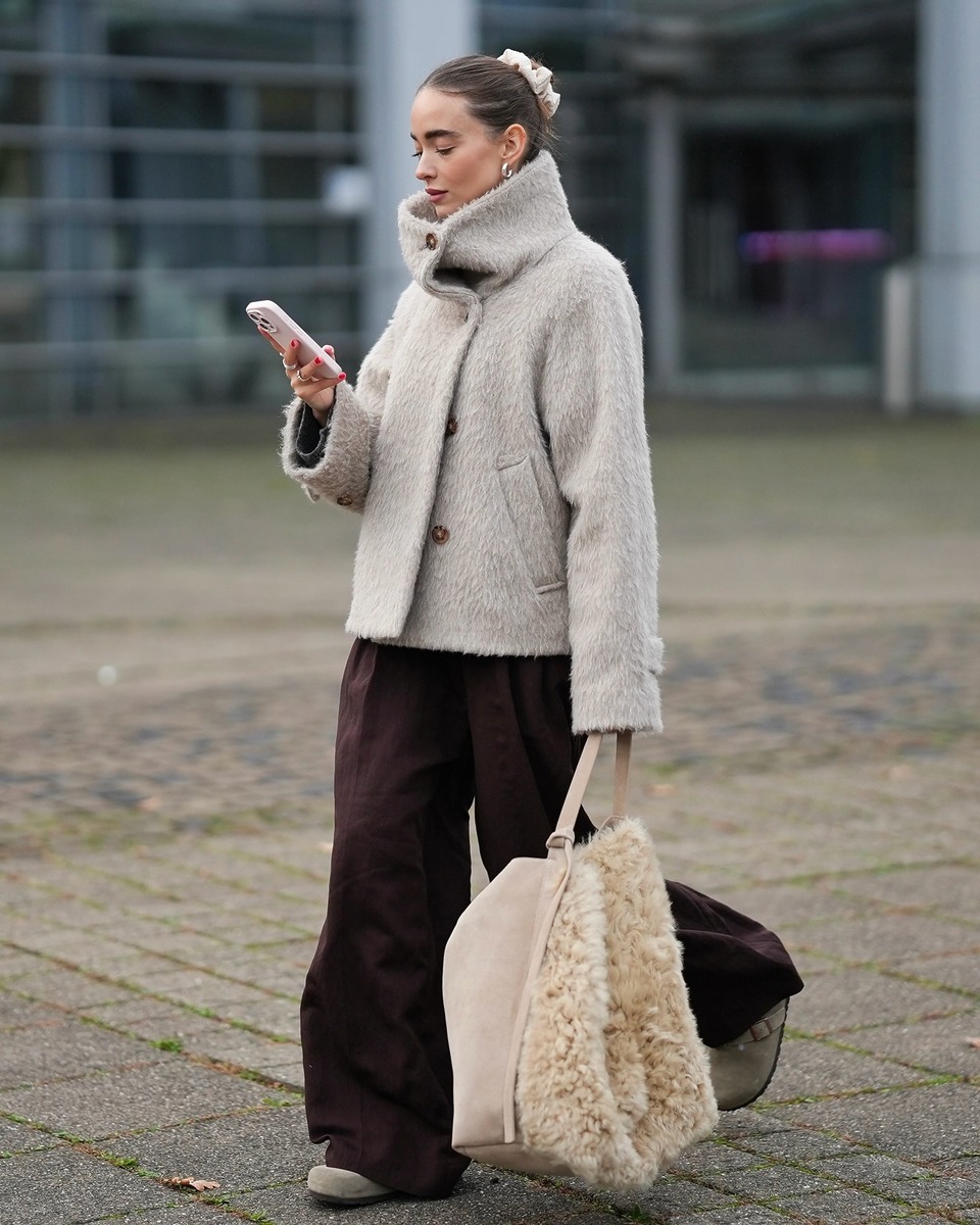 겨울 분위기를 확실하게 내고 싶다면 스웨이드와 퍼가 함께 어우러진 백은 어떨까요? 퍼 디테일이 더해진 스웨이드 백은 어떤 룩에 들어도 즉각적으로 포근한 분위기를 완성해 줍니다. 코트나 패딩은 물론, 심플한 니트 룩에도 잘 어울려 매우 실용적이죠. 하나만 들어도 겨울 분위기가 물씬 느껴지는 룩이 완성되니 별다른 스타일링이 필요 없을 거예요.