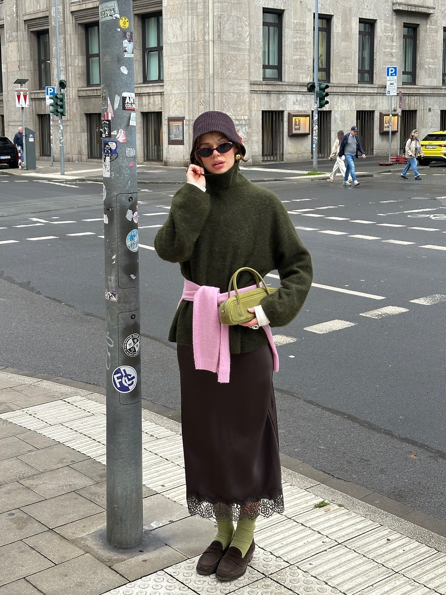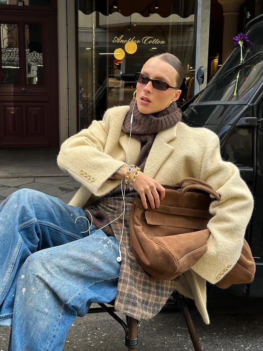 올리브 그린 컬러처럼 차분하면서도 미묘한 색감의 스웨이드 백은 튀지 않으면서도 룩에 신선함을 더해줍니다. 퍼 재킷과 데님처럼 익숙한 조합에 들어주면 과하지 않게 포인트가 살아나고, 겨울 패션 특유의 무거움을 덜어주는 역할도 하죠. 베이직한 컬러가 지겹게 느껴질 때 한번쯤 시도해 보면 좋은 컬러입니다.