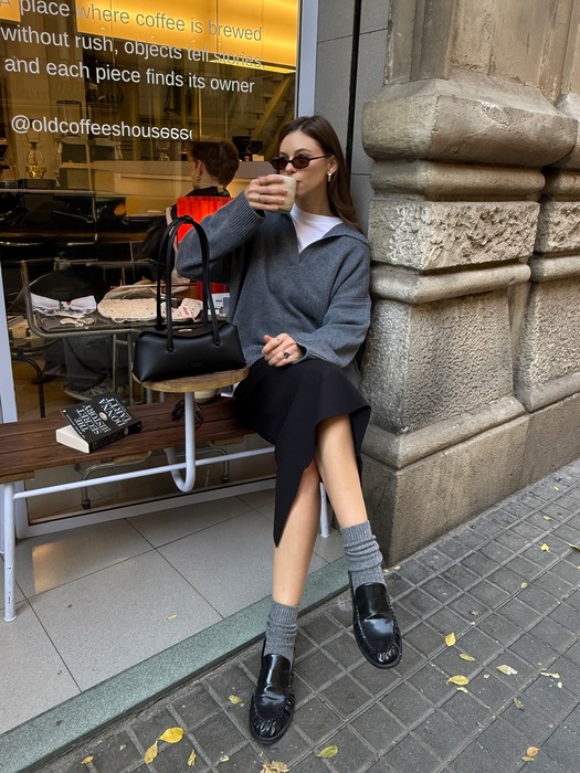 올해 유난히 사랑받은 브이넥 니트. 그레이 컬러로 선택하면 스타일링을 고민할 필요 없이 아주 쉽게 완성되죠. 바로 흰 티를 받쳐 입는 겁니다. 수많은 패피들이 흰 티에 브이넥 니트 조합의 매력을 보여주었어요. 짙은 쥐색 바지를 입거나 검정색 슬랙스를 입는 것이 가장 단정한 룩이죠. 여기에 빅백까지 들면 오피스룩으로도 손색 없어요.