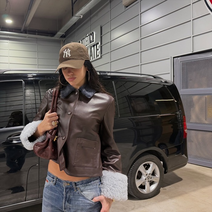 두아 리파의 겨울 데일리 룩에서 빠지지 않는 아이템은 얼굴만 한 오버사이즈 링 귀걸이입니다. 니트나 레더 재킷처럼 텍스처가 강한 아이템일수록 귀걸이는 과감해져야 합니다. 볼드한 링 이어링은 얼굴 윤곽을 또렷하게 잡아주고, 얼굴을 작아 보이게 만들어 줍니다. 이때, 목걸이나 팔찌는 과감히 생략하는 것이 핵심! 귀걸이에만 힘을 실어야 과하지 않고 세련된 인상을 유지할 수 있어요.