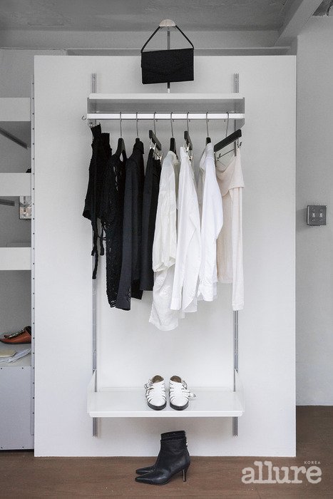 공간 디자이너와 함께 공간을 꾸밀 때 ‘수집한 빈티지 가구 외에는 전부 만들자’ ‘금속만 사용하자’ ‘조립식으로 만들자’는 규칙을 정했다. 행어와 선반은 모두 모듈형으로 제작하고, 프리소 크라머, 베르너 팬톤, 그리고 개인적으로 좋아하는 마리오 보타의 쇼군 램프 등 차곡차곡 모아온 빈티지 가구를 더해 완성했다.