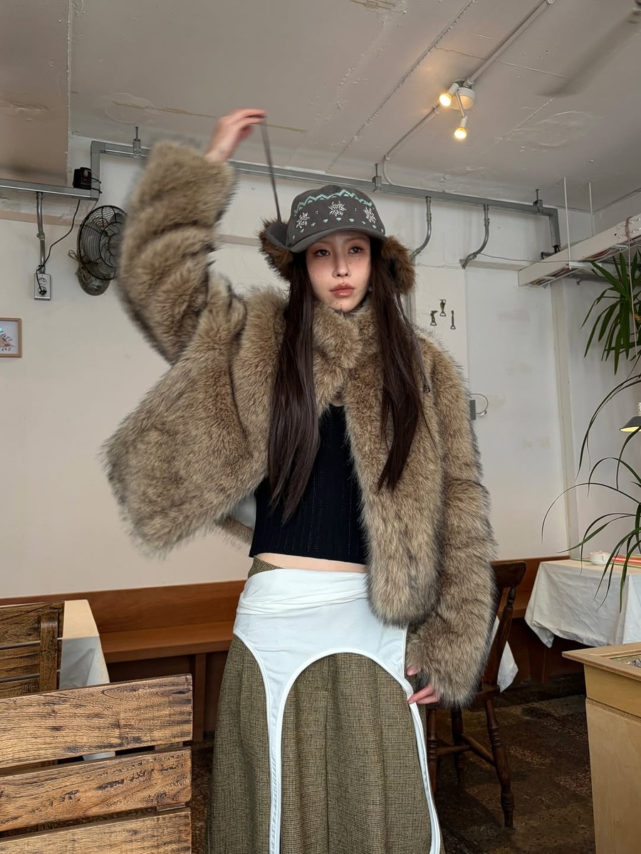 퍼 아이템을 좀 더 사랑스럽게 연출하고 싶다면 에밀리처럼 슬림한 원피스에 퍼 볼레로를 더해 보세요. 계절감도 살릴 수 있어 겨울 모임이나 데이트룩으로 딱!