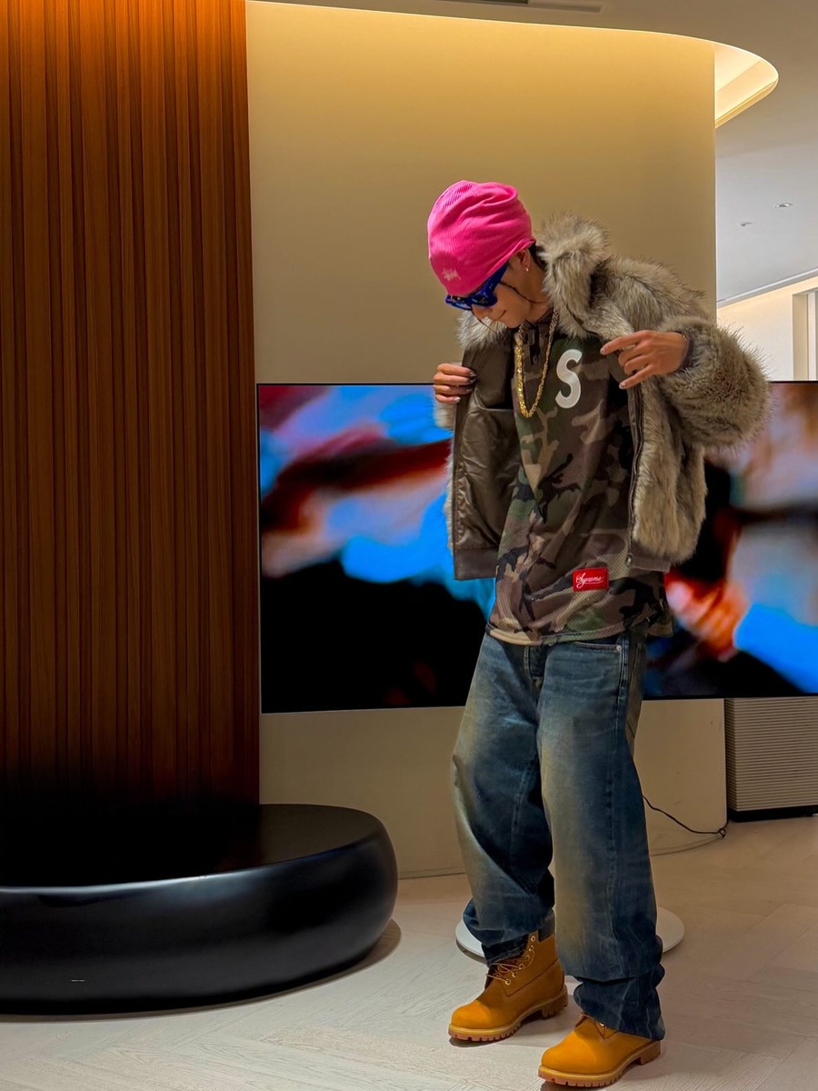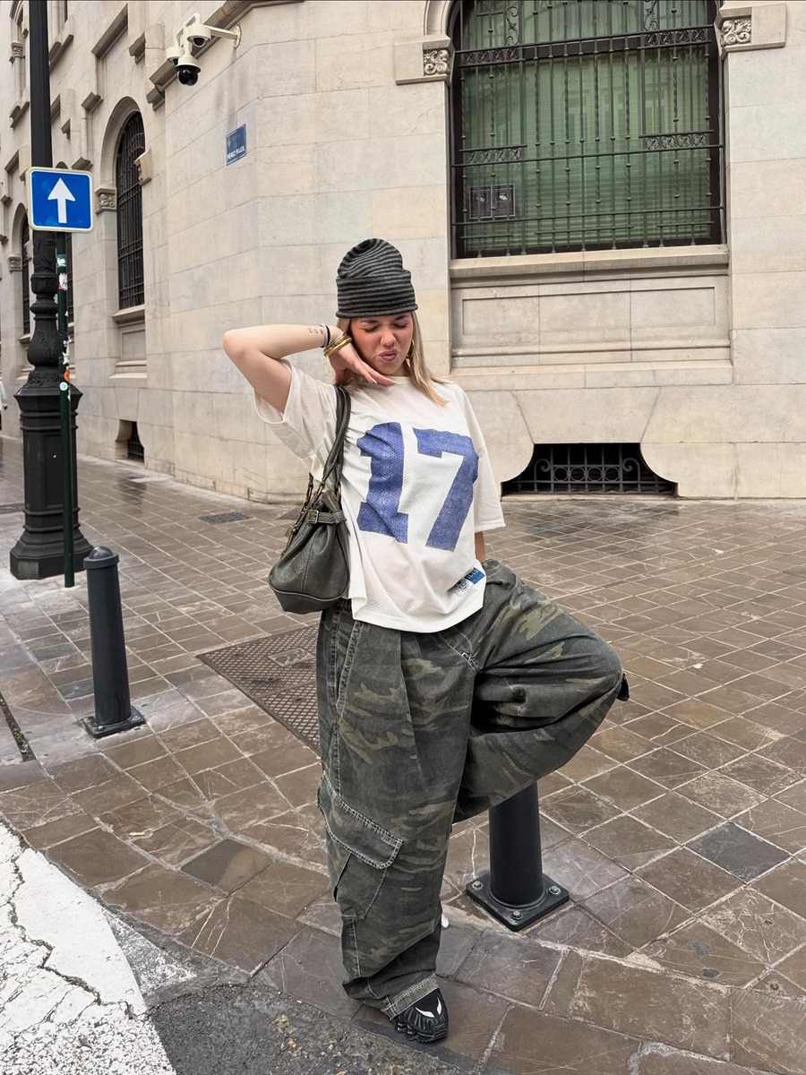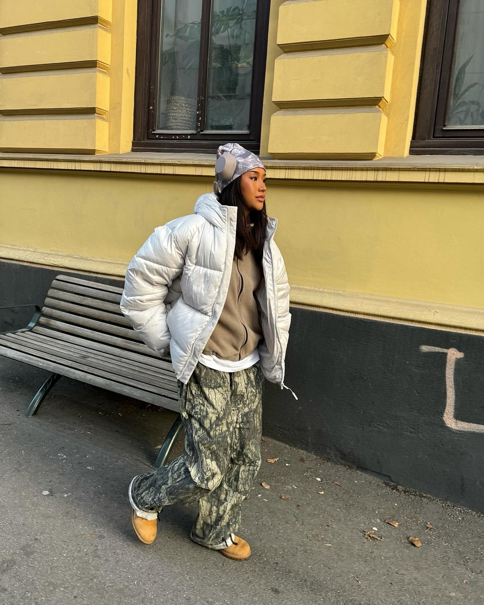 카모플라주가 낯설게 느껴진다면 가장 먼저 팬츠부터 시작해 보세요. 넉넉한 오버사이즈 실루엣의 카모 팬츠는 그 자체로 쿨한 무드를 만들어 주죠. 오버사이즈 티셔츠나 패딩처럼 넉넉한 상의를 매치하면 스트릿무드가 자연스럽게 살아납니다. 이때 슈즈는 투박한 스니커즈나 워커로 무게감을 맞추는 것이 중요해요. 마지막으로 비니까지 더해주면 힙한 분위기가 한층 강조되며, 카모 특유의 터프함이 겨울 데일리룩에 자연스럽게 스며듭니다.