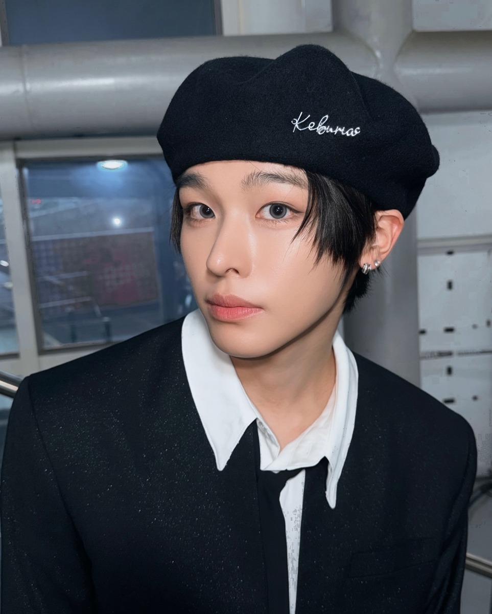 NCT 위시 리쿠는 블랙 베레모로 프레피 룩을 완성했어요. 베레모를 쓸 때는 리쿠처럼 옆머리를 자연스럽게 내려 얼굴선을 감싸면 얼굴이 훨씬 작아 보이는 효과를 얻을 수 있답니다.