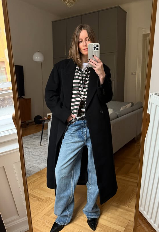 블랙 터틀넥과 스트레이트 데님 위에 테일러드 롱 코트를 걸쳐 시크하게, 스트라이프 티셔츠와 와이드 데님 팬츠 위에 걸쳐 캐주얼하게 연출한 센스를 눈여겨보세요.