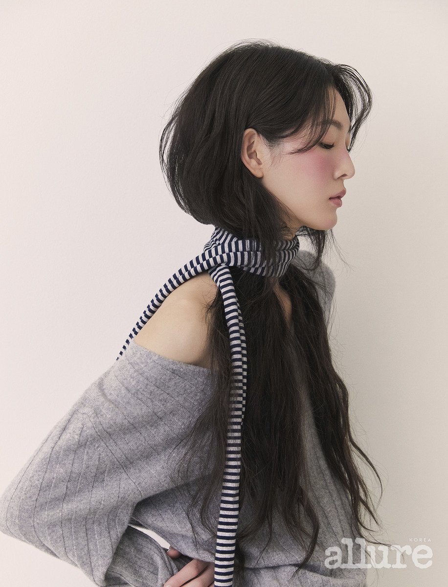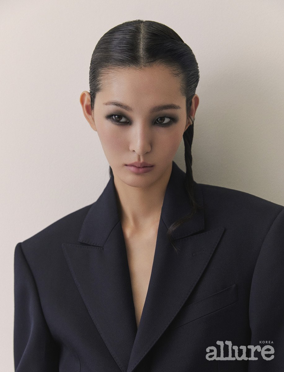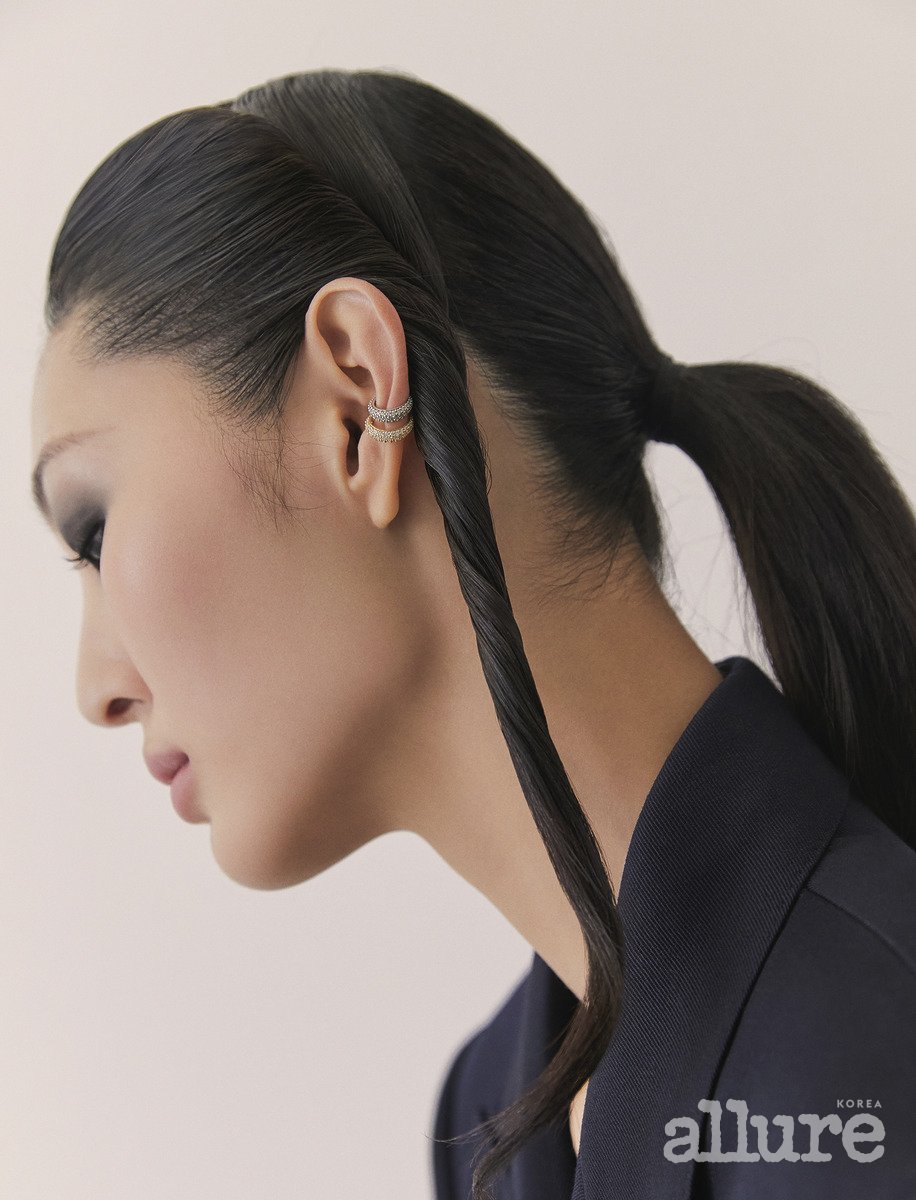 시크한 브이넥에는 슬릭하게 빗은 머리가 제격. 머리를 풀어헤치기보다는 아래로 단정하게 묶어 깔끔함을 강조하는 것이 좋다. 해당 스타일이 단조롭게 느껴진다면 꼬은 머리를 포인트로 주어 재킷 위로 무심하게 툭 떨어뜨리자. 정 가르마를 기준으로 한쪽 옆머리만 소량 빼내서, 스프링처럼 돌돌 마는 방식이다. 이때 점성이 있는 오일을 바르면 웻한 텍스처가 표현되어 한층 감각적이고 유니크한 스타일이 완성된다. 컬을 바깥쪽으로 말면 얼굴이 시원하게 드러나며 개방감을 주고, 안쪽으로 말면 분위기가 우아해진다. 꾸안꾸 스타일을 원한다면 모발을 손가락으로 돌돌 만 뒤, 열을 가해 느슨한 컬을 만들어보자.