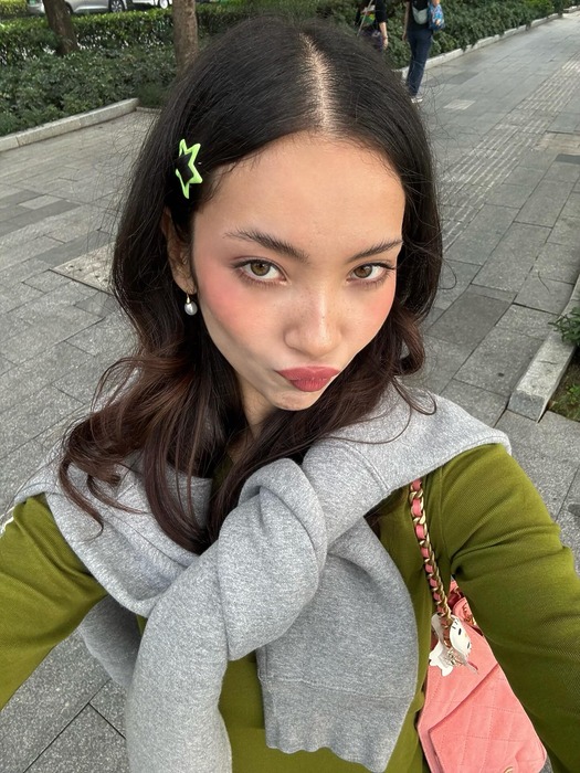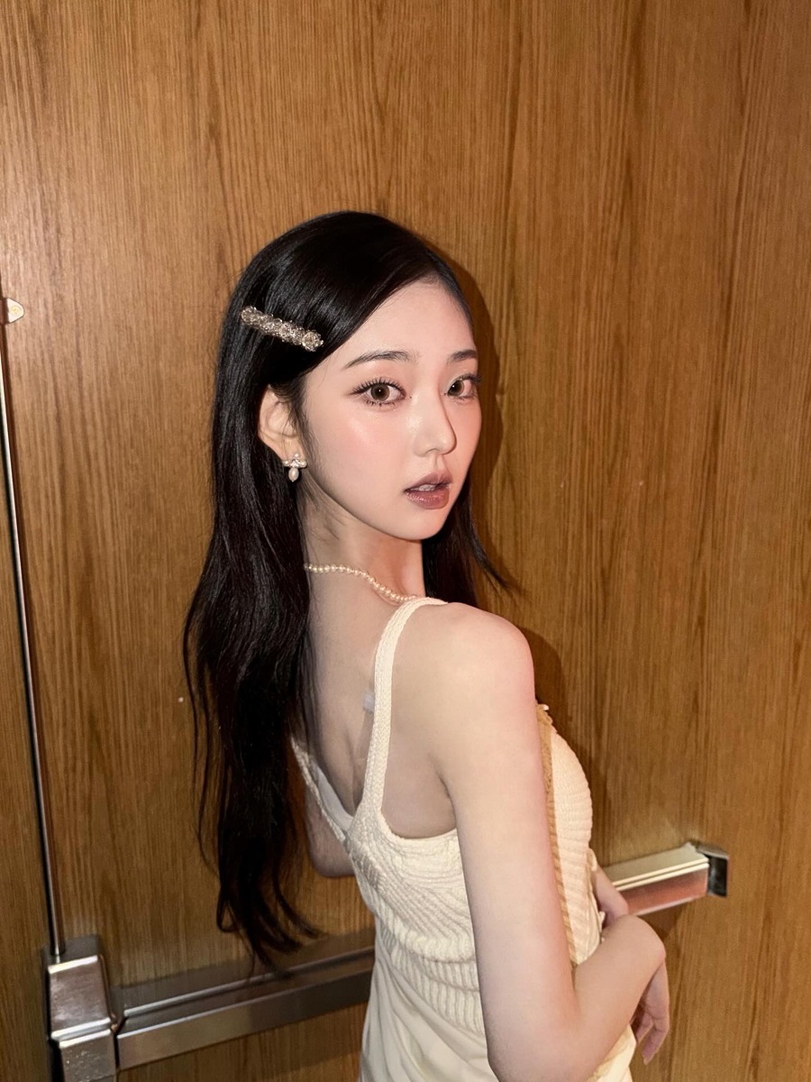 실핀을 잔머리 고정용으로만 생각했다면 오산입니다. 깔끔한 실핀 역시 충분히 스타일링 포인트가 될 수 있죠. 태연처럼 화이트 실핀 두 개로 앞머리를 살짝 고정해주면 과하지 않으면서도 세련된 포인트가 살아납니다. 앞머리를 너무 바짝 넘기기보다는 이마 라인을 자연스럽게 덮어주면 얼굴이 훨씬 작아 보이는 효과도 있죠. 일정한 간격으로 실핀을 나란히 꽂아 유니크한 연출을 시도해 보는 것도 좋습니다. 헤어 컬러가 어둡다면 실핀은 밝은 색을 선택해 대비를 주는 것을 추천해요.