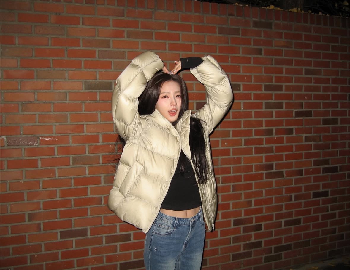패딩에 데님을 매치하려고 한다면 미연처럼!! 은근하게 빛나는 샤이닝한 패팅에 심플한 블랙 이너, 배가 살짝 드러나는 핏의 데님으로 심플하면서도 은근하게 힙한 감성을 잡았죠. 캐주얼한 룩에는 헤어 메이크업은 최대한 자연스럽게, 불필요한 액세서리는 과감하게 생략하는 것이 미덕이라는 사실도 잊지 마세요!