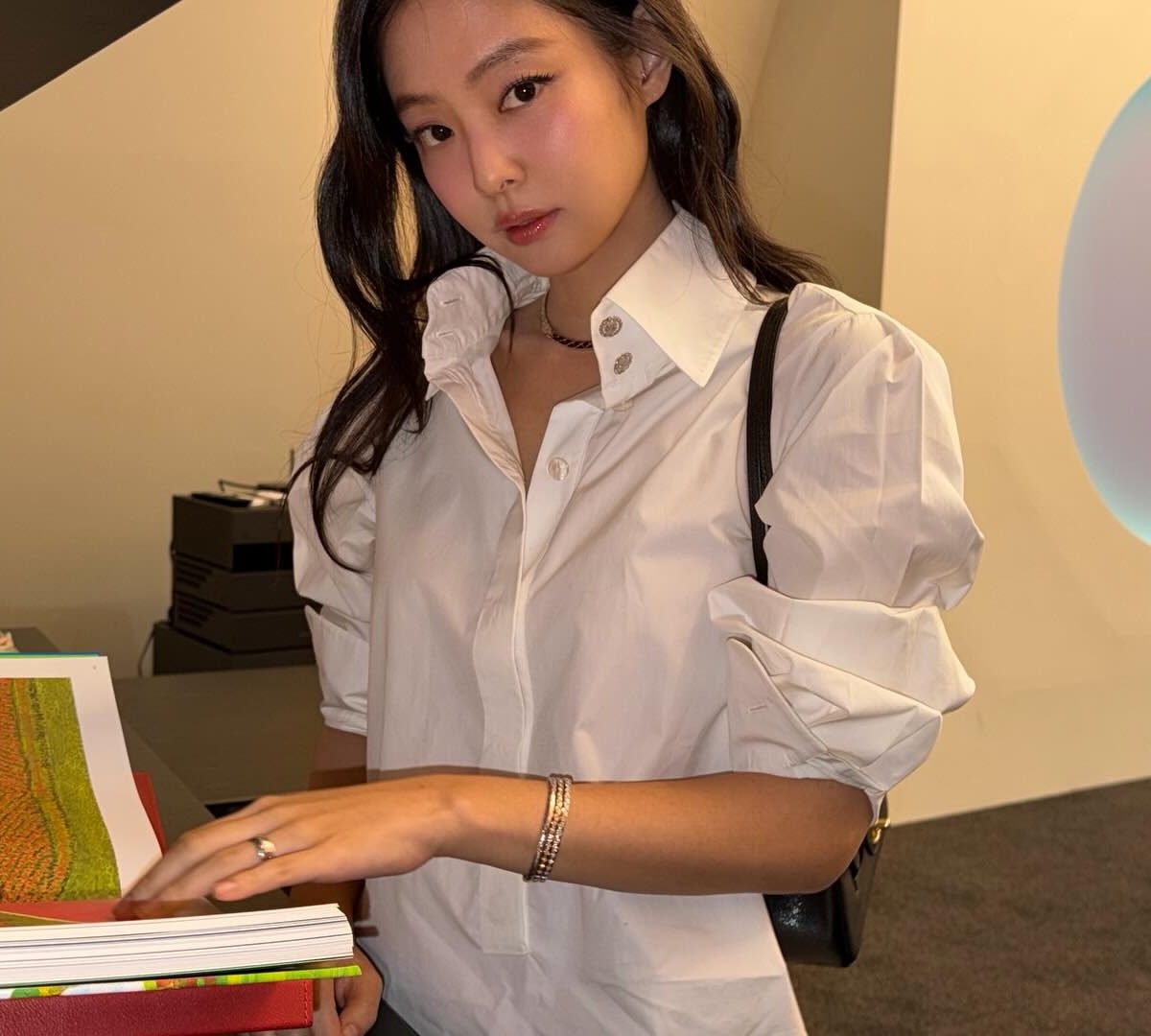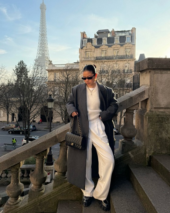 화이트 셔츠와 데님 팬츠는 누구나 하나쯤 가지고 있는 기본 아이템이지만, 스타일링의 완성도를 높이려면 디테일에 주목해야 합니다. 버튼이 중간까지만 오는 하프 버튼 셔츠나 포켓에 로고 플레이가 더해진 데님 팬츠처럼 말이죠. 제니처럼 카라가 넓은 셔츠를 선택하면 얼굴이 작아 보이는 착시 효과까지 기대할 수 있을 거예요.