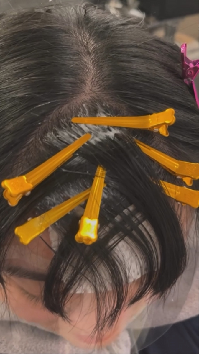 그럼 모류교정은 어떻게 할 수 있을까요? 가장 많이 행해지는 방법으로는 ‘펌‘과 ‘드라이‘가 있습니다. 앞머리의 경우 해당 영역의 모발을 위의 사진처럼 좌우 교차해 크로스로 고정한 다음 펌을 진행합니다.