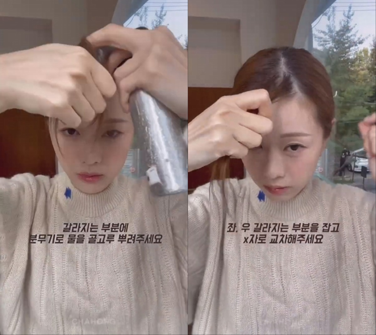 드라이도 이와 비슷한 방식입니다. 먼저 건조한 모발에 손질하기 쉽도록 물을 고루 뿌려 줍니다. 그리고 위의 펌 사진처럼 모발이 갈라지는 부분을 양 옆으로 나눠 잡고 좌우를 교차해 X자 모양으로 만들어 주세요.