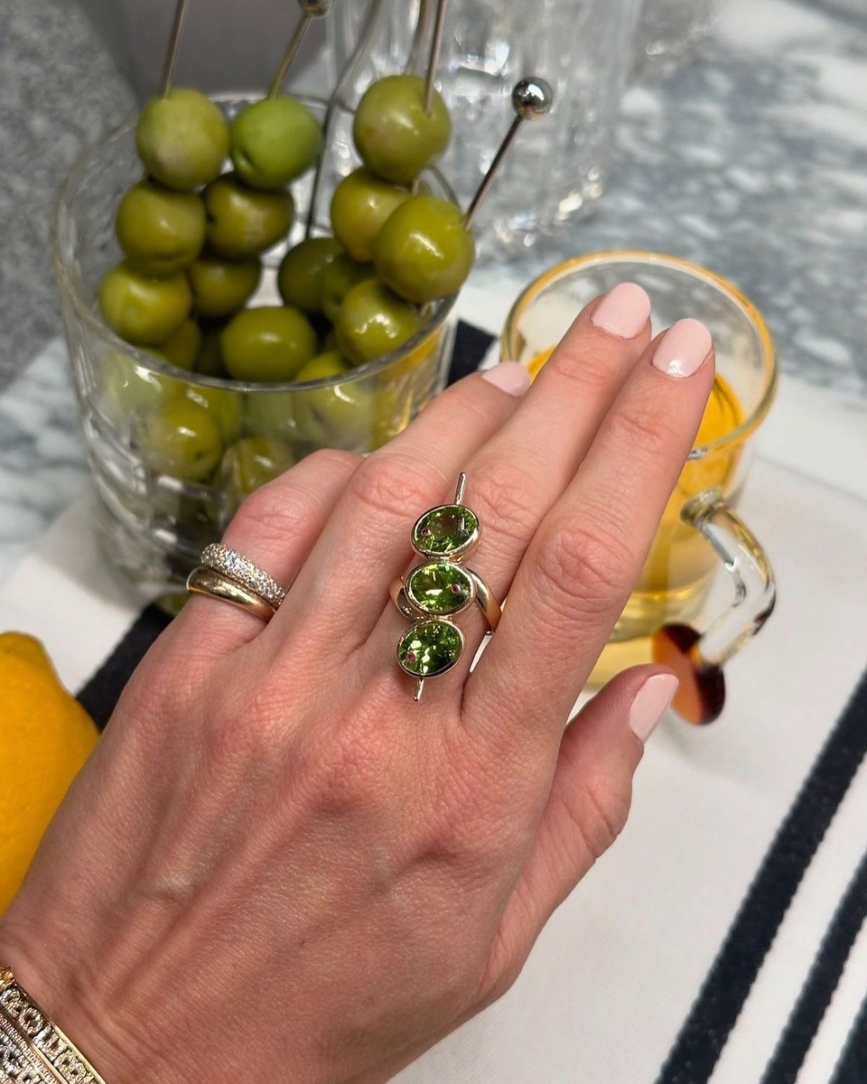 어린 시절, 문구점에서 팔던 반지처럼 형형색색의 키치한 반지 역시 올해 트렌드 중 하나입니다. 색감뿐 아니라 형태 역시 위트를 더했죠. 마티니에 올라가는 올리브 꼬치를 형상화한 반지부터 리본 모양 반지, 그리고 효민이 착용한 쨍한 형광 연두색 반지까지! 더 이상 반지에 정답을 정해두지 않아도 좋아요. 2026년에는 자유롭게, 내가 끼고 싶은 반지를 껴도 좋습니다.