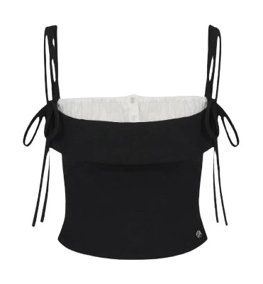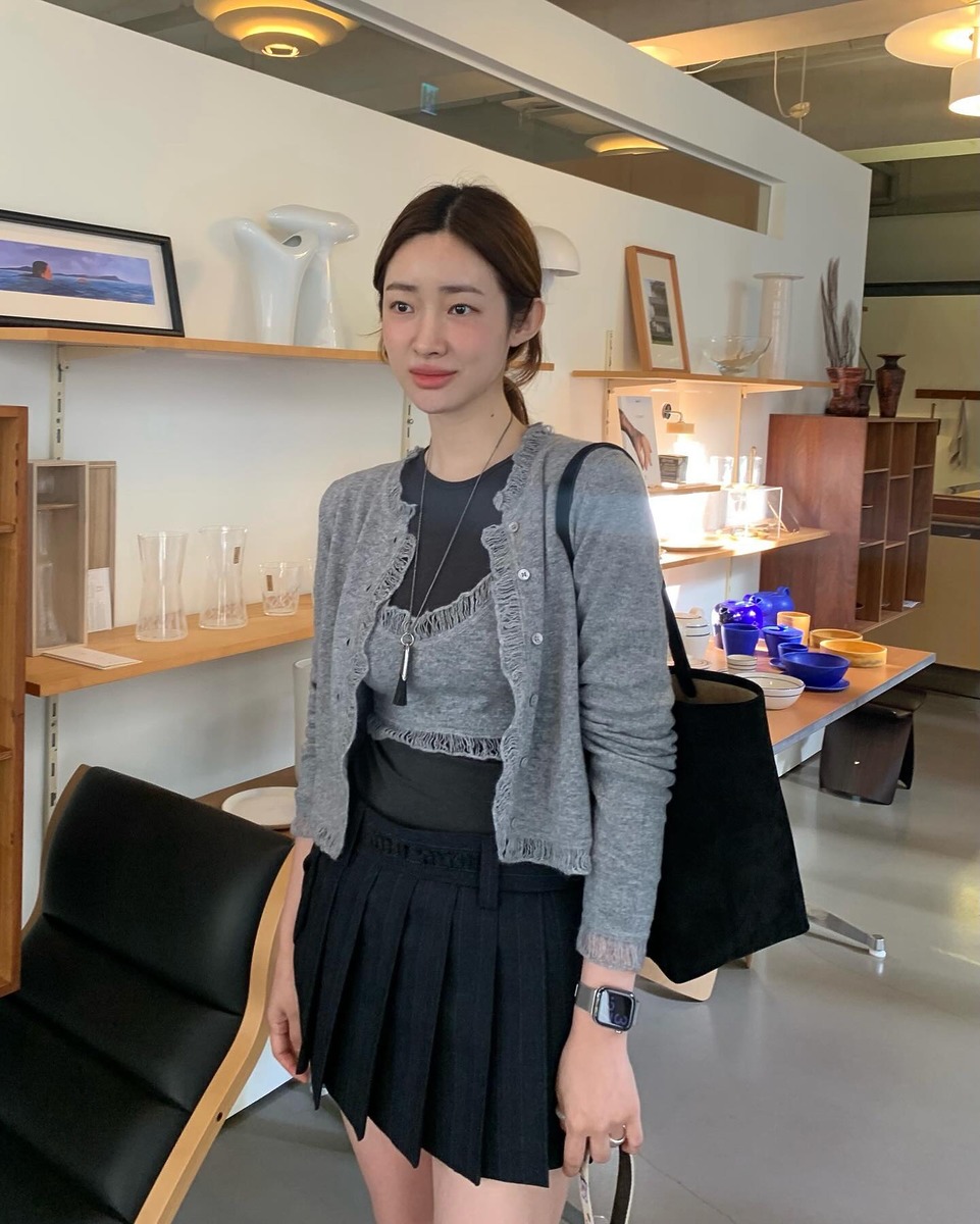 레이어드에 도전하고 싶지만 막막하게 느껴졌다면 차정원의 룩에서 힌트를 얻어 보세요. 러플 디테일이 돋보이는 뷔스티에와 카디건 셋업으로 사랑스러운 분위기를 완성했는데요. 뷔스티에 아래에는 차콜 컬러 티셔츠를 레이어드해 톤온톤 스타일링으로 정리했습니다. 이렇게 이너와 뷔스티에의 톤을 맞춰주면 레이어드가 훨씬 깔끔해 보일 거예요.