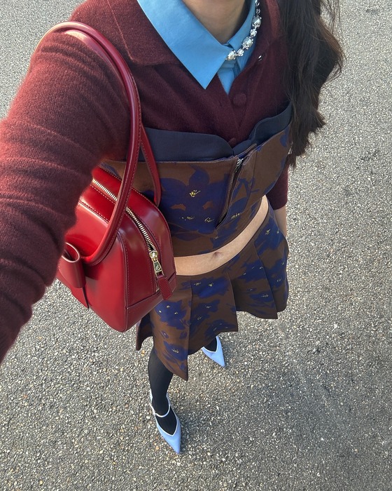 늘 입던 카디건 위에 뷔스티에를 더하는 것도 좋은 선택. 인플루언서 박민주는 버건디 카디건 위에 플로럴 패턴 뷔스티에를 레이어드해 단정하면서도 러블리한 무드를 연출했어요. 같은 패턴의 스커트를 매치해 스타일링의 완성도를 높인 점도 인상적입니다. 여기에 블루 셔츠와 펌프스 힐을 더해 자칫 단조로워 보일 수 있는 룩에 확실한 포인트를 더했죠.