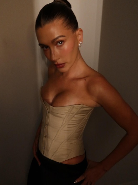 과감한 뷔스티에는 그 자체로 파티 룩이 되기도 합니다. 이때 중요한 건 주얼리 선택! 귀걸이와 목걸이 중 하나에만 힘을 줘야 스타일링이 과해 보이지 않거든요. 헤일리 비버는 베이지 뷔스티에에 블랙 슬랙스를 매치해 미니멀하면서도 관능적인 룩을 연출했습니다. 목걸이 대신 화려한 이어링을 선택해 훨씬 세련된 인상을 완성했죠. 반면, 헤일리의 절친 벨라는 데님 뷔스티에에 레이스 초커를 더해 한층 드라마틱한 무드를 강조했습니다.