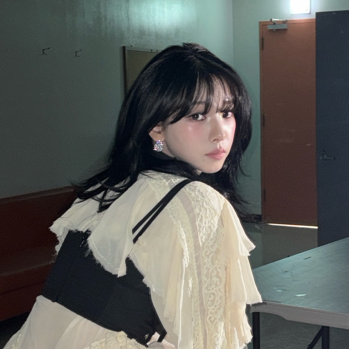 로맨틱한 무드의 레이스 블라우스 위에 블랙 뷔스티에를 레이어드한 카리나. 작은 사이즈의 뷔스티에가 블라우스의 디테일을 살리면서도 허리 라인을 자연스럽게 잡아 주어 부해 보이지 않는 실루엣을 완성했습니다. 하의와 부츠까지 블랙으로 통일해 전체 스타일링에 안정감을 더한 것도 눈여겨볼 포인트죠.