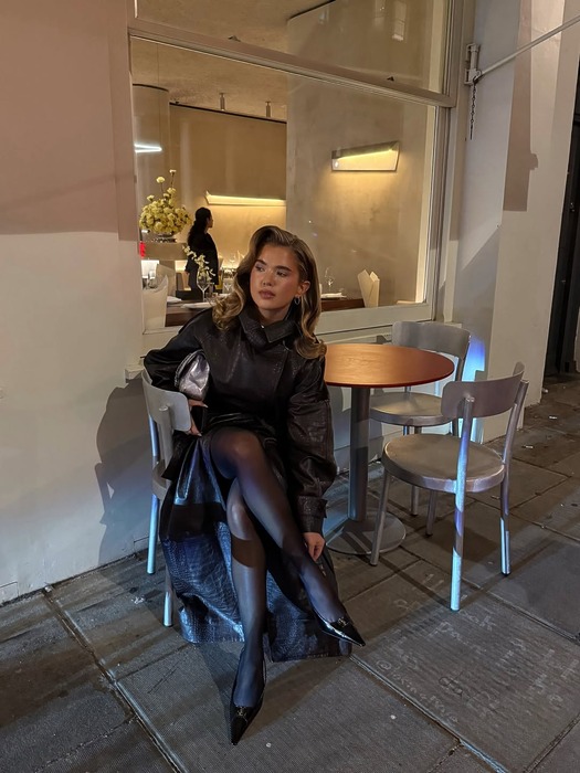 레더 코트와 스커트 조합은 바로 이런 느낌입니다. 요즘 한창 유행하는 미디 스커트에 스틸레토 힐이나 부츠를 신어 여성스러움을 강조하기에 적합하죠. 우아하고 고급스러운 레더 코트나 블루종에 스커트를 입는다면 클래식하고도 심플한 룩이니 추천할게요. 매번 레더에 바지만 입었다면 올겨울 시도해 보기 좋아요.