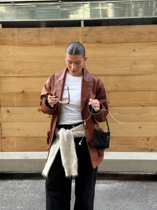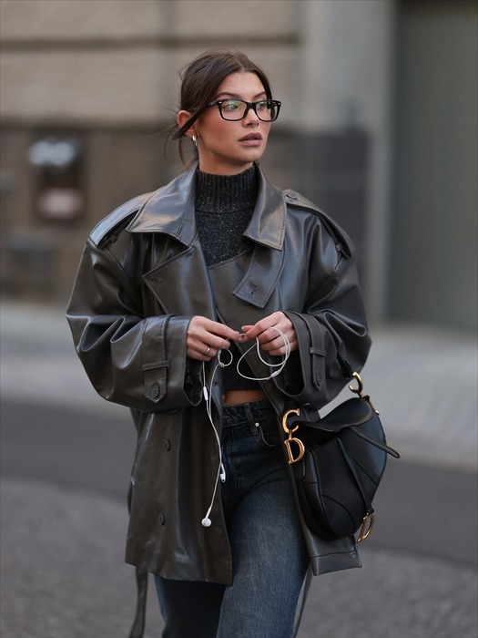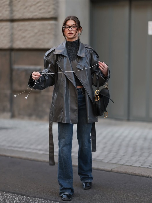 시크한 매력이 있는 레더 코트는 길면 길수록 멋있어요. 코디 고민도 딱히 신경 쓰지 않아도 됩니다. 그냥 막 입어도 멋있는 아이템이기 때문이죠. 레더 코트를 입을 때 신경 쓰면 좋은 건 바로 바지입니다. 크림색 진을 입으면 화려함이 강조되고, 청바지를 입으면 편안한 룩이 완성됩니다. 이때 반지나 귀걸이 등의 주얼리를 활용하거나 머플러, 비니 등의 액세서리를 통해 어딘가 부족한 코디를 채워주면 좋아요.