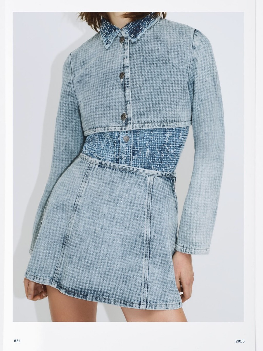 무드가 다른 아이템을 더하는 것뿐 아니라 데님 아이템 자체가 새로운 스타일을 적용한 사례도 어렵지 않게 찾아볼 수 있어요. 인플루언서 벨라는 차이나 카라에 벨티드 디테일이 더해진 슬림핏의 데님 재킷으로 여성스러우면서 레트로한 룩을 완성했으며 디젤은 캐주얼의 대명사인 데님 소재 미니 원피스에 클래식한 패션에 빠지지 않는 하운드 투스 체크 패턴을 더하는 위트를 선보였습니다.