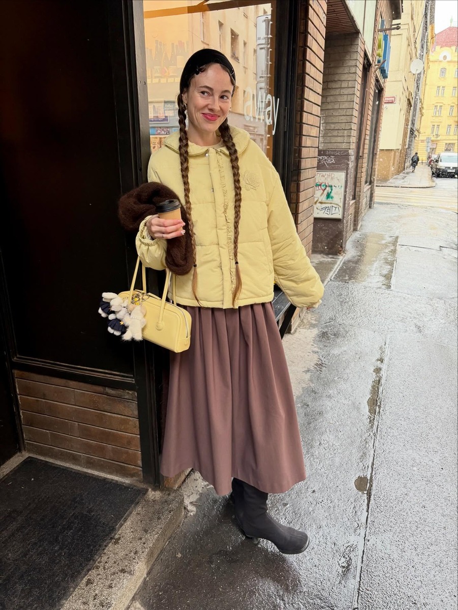 겨울에도 색을 포기할 필요는 없어요. 버터옐로처럼 부드러운 컬러의 패딩에 브라운 롱스커트를 매치하면 산뜻하면서도 계절감 있는 룩이 완성돼죠. 여기에, 블랙 부츠로 중심을 잡아주면 룩에 안정감이 생기고요. 밝은 아우터를 입을 때는 스커트의 소재를 묵직하게 선택해 겨울 특유의 무드를 유지하는 것도 잊지 마세요.