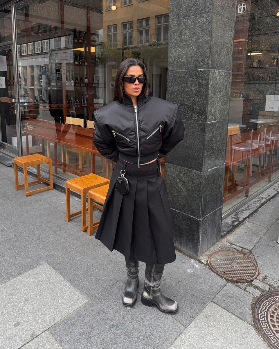 블랙 플리츠 롱스커트는 언제나 믿고 입을 수 있는 선택지예요. 주름이 만드는 세로 라인이 체형을 정돈해 주고, 움직일 때마다 생기는 리듬감 덕분에 룩이 단조롭지 않죠. 라이더 부츠와 봄버 재킷을 매치하면 단정함에 시크함이 더해져 세련된 룩이 완성됩니다. 상의는 너무 화려하지 않게 가져가고, 재킷의 볼륨으로 균형을 맞추는 것이 이 룩의 포인트! 출근룩부터 데일리룩까지 두루 활용할 수 있는 활용도 높은 스타일링입니다.