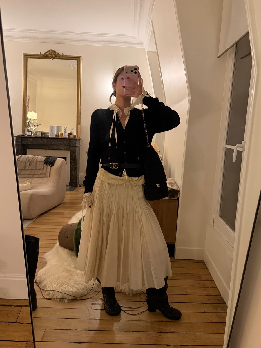 셔링이 잡힌 롱스커트는 두꺼운 겨울옷 사이에서도 충분히 가볍고 부드러운 무드를 만들어줍니다. 러플 블라우스와 블랙 카디건을 매치하면 사랑스러운 인상이 살아나고, 여기에 투박한 부츠를 더하면 페미닌함을 자연스럽게 눌러주죠. 중요한 건 텍스처의 대비! 흐르는 듯한 스커트와 묵직한 슈즈를 함께 매치해 안정감을 더해 보세요.