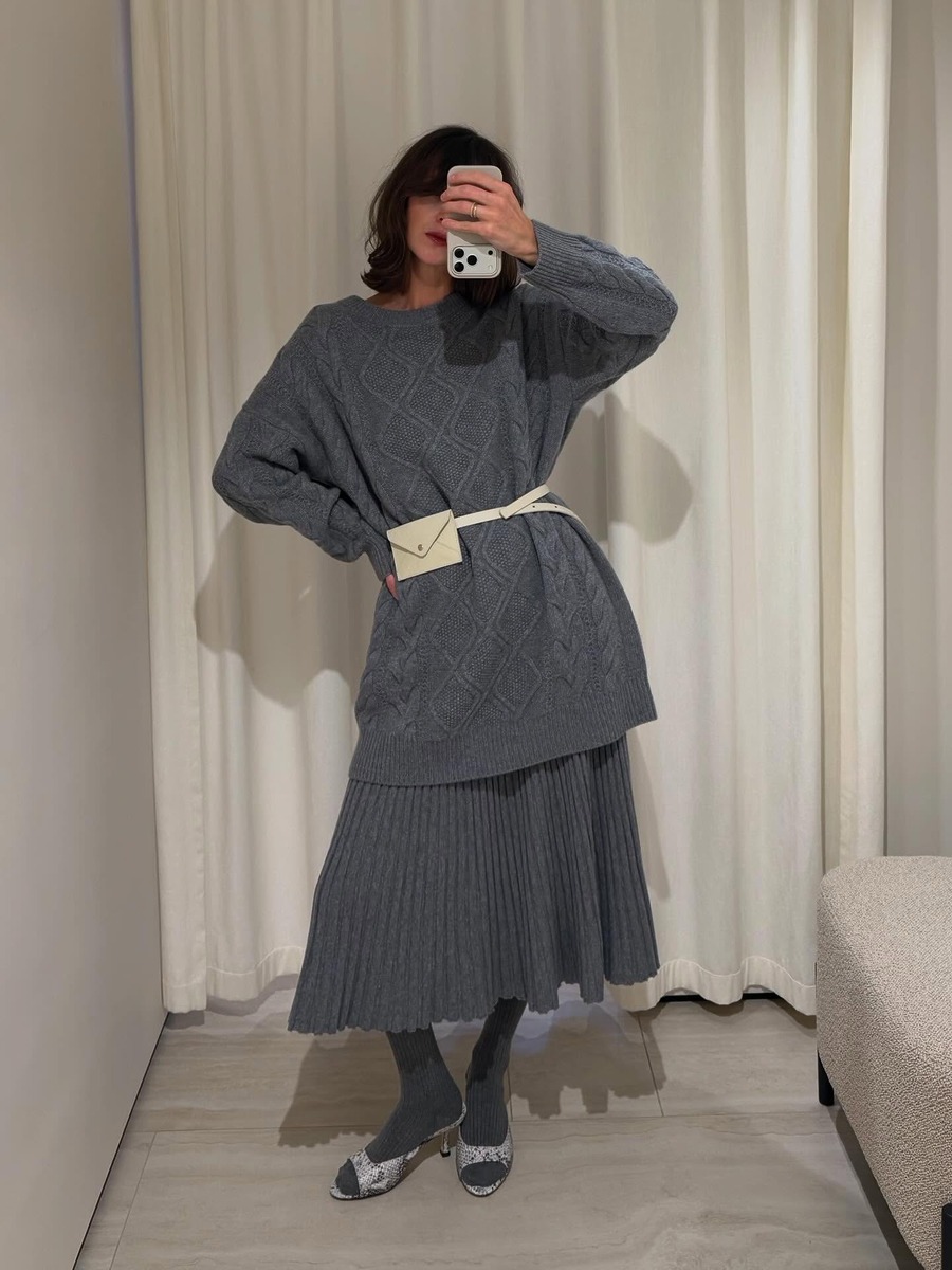 박시한 니트와 롱스커트 조합은 겨울 특유의 포근함을 가장 잘 살려주는 조합. 전체 실루엣을 여유 있게 가져가면 걸리시하고 내추럴한 분위기가 살아나요. 체형이 흐려 보일까 걱정된다면 벨트를 활용해 허리선을 살짝 잡아주세요. 니트는 엉덩이를 살짝 덮는 길이가 가장 안정적이고, 스커트는 너무 퍼지지 않는 디자인을 골라야 균형 잡힌 스타일링이 완성됩니다.