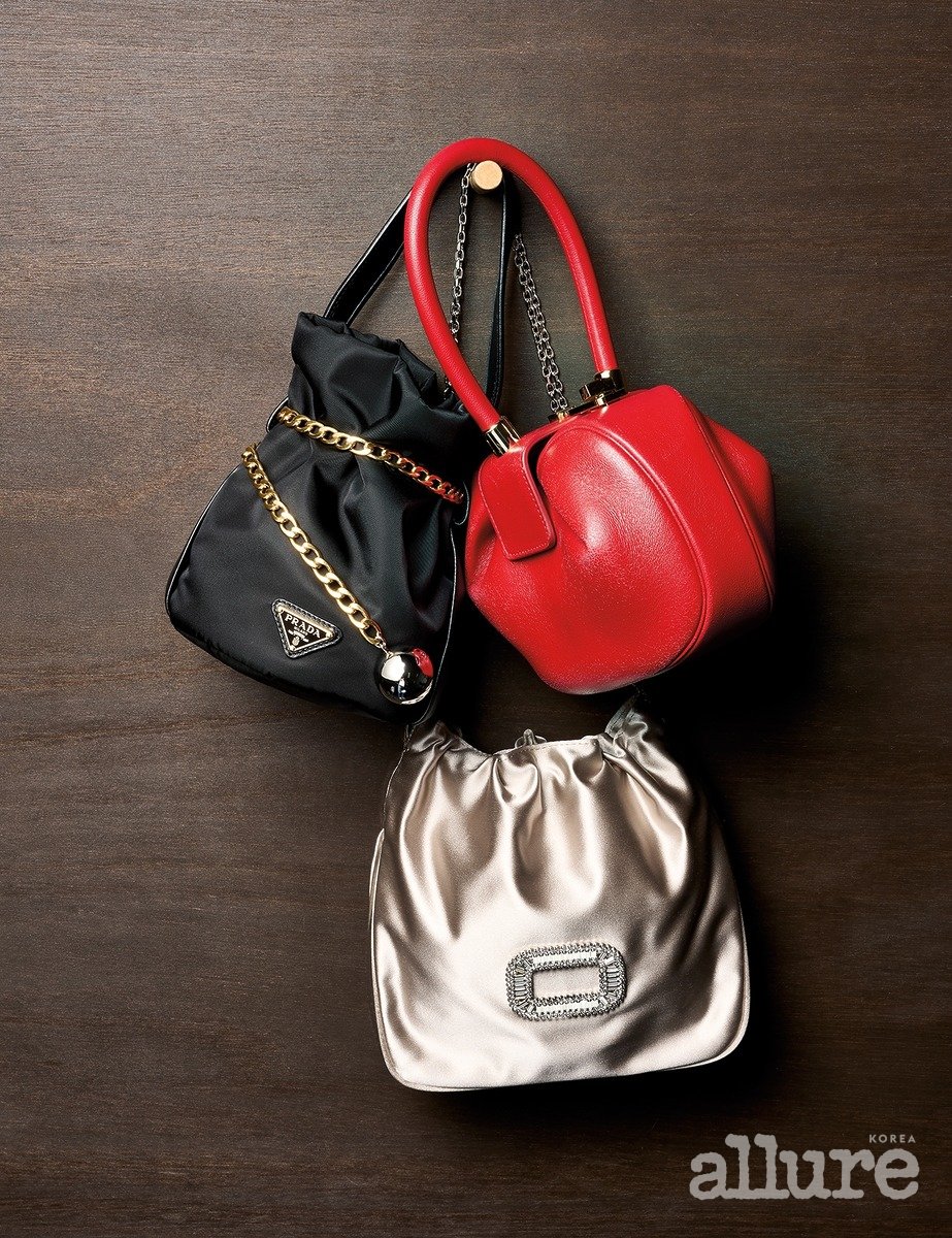 볼 펜던트 체인을 장식한 버킷백은 3백10만원 프라다(Prada).