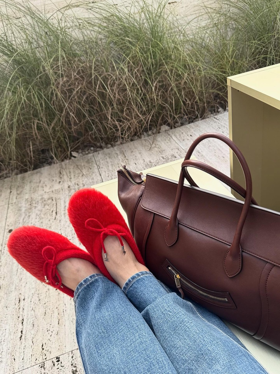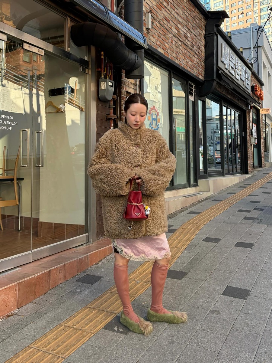 퍼 플랫슈즈가 처음이라면 우선 톤 다운된 컬러부터 시작해 보세요. 브라운 시어링 재킷에 핑크 니삭스, 그린 퍼 플랫슈즈를 매치하되 채도를 낮추면 전체적인 룩이 한결 안정적으로 보입니다. 그린 컬러의 퍼 플랫슈즈는 슬랙스나 데님과도 잘 어우러져 의외로 활용도가 높고, 칙칙해지기 쉬운 겨울 패션에 은은한 생기를 더해주는 역할을 하죠. 여기에 레드 미니백처럼 작은 포인트 아이템 하나만 더하면 컬러 플레이가 살아나면서도 산만해 보이지 않는 스타일링이 완성됩니다.