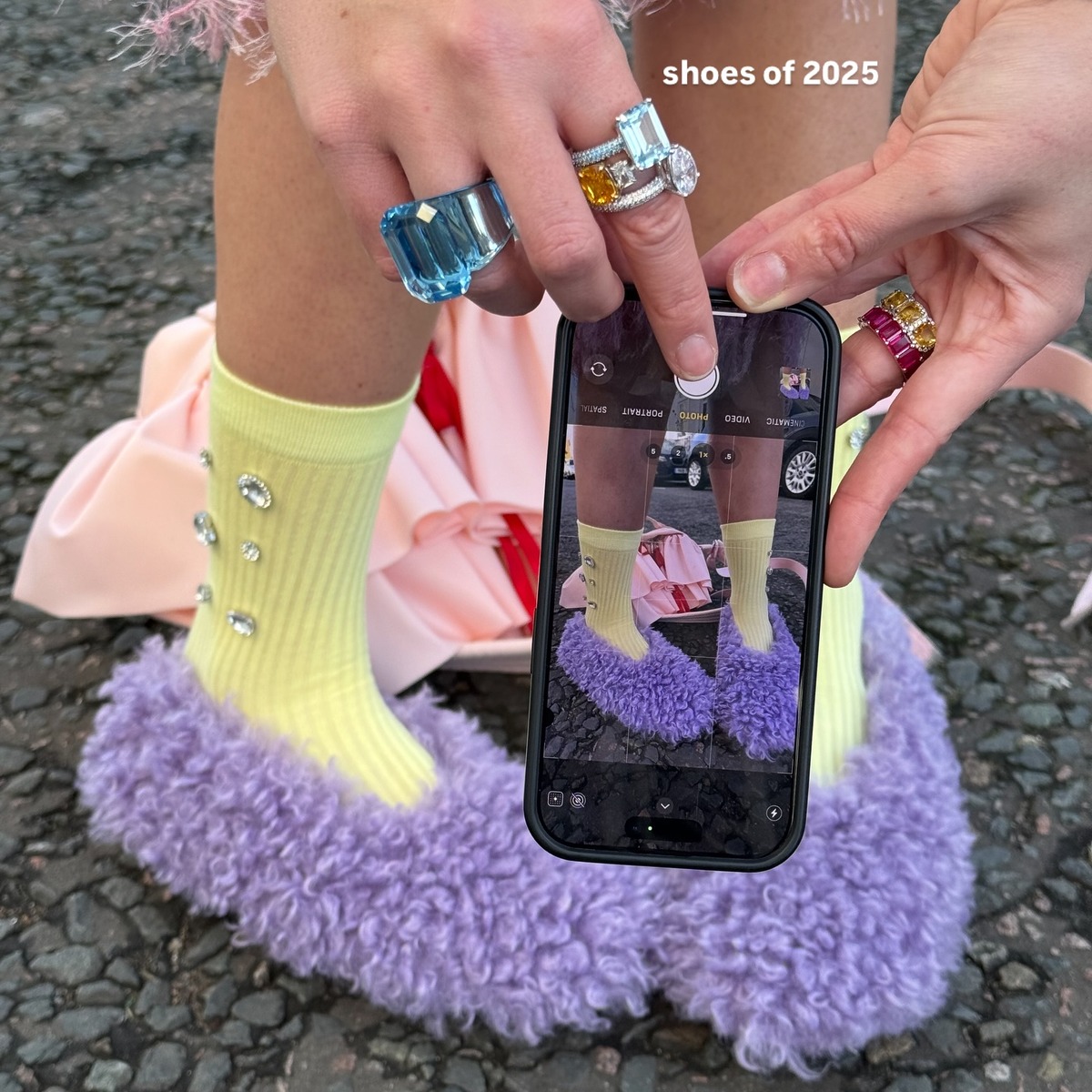 비즈 디테일이 더해진 퍼 플랫슈즈는 그 자체로 액세서리 역할을 톡톡히 해냅니다. 화려해 보일 수 있지만, 겨울에는 옷의 소재와 볼륨이 무거워지기 때문에 오히려 확실한 포인트가 되어주죠. 코트나 니트처럼 단순한 아이템과 함께 매치하면 시선이 자연스럽게 슈즈로 집중되며, 칙칙한 겨울 룩에 은근한 위트를 더할 수 있을 거예요.