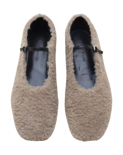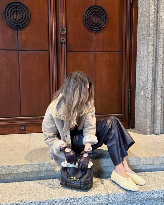 무스탕 재킷과 레더 팬츠처럼 강한 소재가 만난 룩에는 아이보리 퍼 플랫슈즈가 좋은 완충제가 됩니다. 퍼 특유의 부드러운 질감 덕분에 전체적인 인상이 한결 편안해 보이고, 룩의 균형도 자연스럽게 맞춰주죠. 아이보리 컬러는 어떤 겨울 아우터와도 잘 어울려 활용도가 높고, 컬러 삭스나 니삭스와의 조합도 쉬워 자주 찾게 될 거예요.