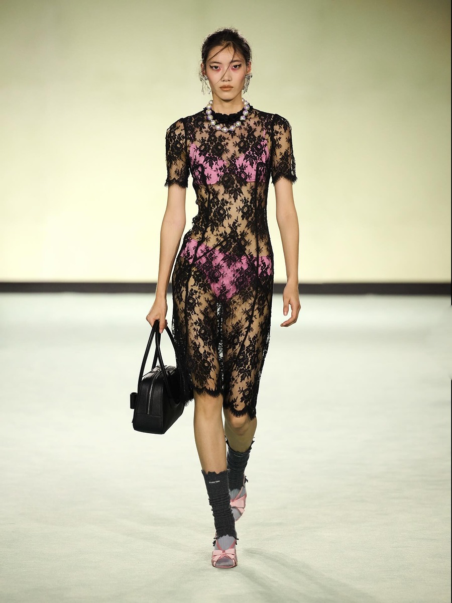 하의, 그리고 드레스에도 레이스는 활발하게, 그리고 다양하게 사용되고 있습니다. 연지처럼 스포티한 아노락과 청순한 레이스 미니스커트를 함께 매치하면 귀여우면서도 발랄한 느낌을 강조할 수 있죠. 반면 슈슈통 26 봄/여름 컬렉션에서 레이스는 대담하고 과감한 룩을 만드는 키 요소로 활약했습니다. 앤더슨 벨은 쇼츠 밑단에 각각 색이 다른 레이스를 넣어 젠더 플루이드적인 피스를 선보였고 린다는 끝단에 레이스가 살짝 추가된 롱스커트를 활용해 깔끔한 룩에 포인트를 주었어요. 이렇게 컬러, 기장, 옷 종류에 관계없이 레이스는 다방면으로 활약할 예정입니다.