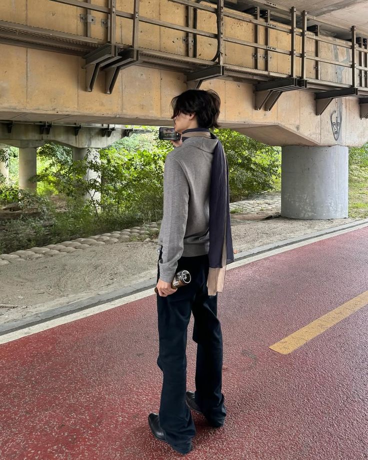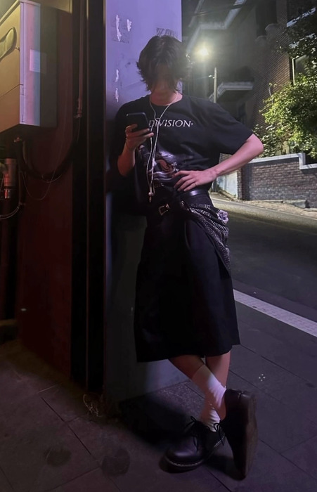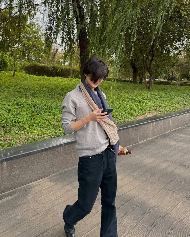 눈이 오나 비가 오나, 심지어 한여름에도 그의 룩에는 스카프는 빠질 수 없어요. 그레이 맨투맨에 루즈핏의 블랙 데님을 입고 휘날리는 시어한 소재의 스카프를 매치한 룩을 참고해 보세요. 스카프를 한 번만 감아 옆으로 길게 늘어뜨리는 게 포인트에요.