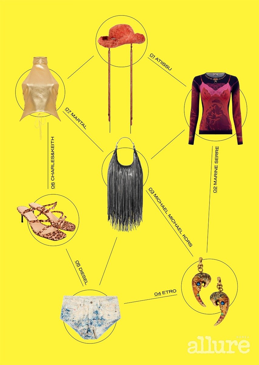 여러 문화를 혼합한 아이라 스타의 음악처럼 다양한 텍스처를 오가는 Y2K 버전의 아프로비츠 룩. 흔들리는 프린지 디테일이나 발목을 드러내는 가벼운 스트래피 힐 등 몸을 움직일 때 동반되는 자연스러운 노출을 생각하며 아이템을 믹스앤매치한다.