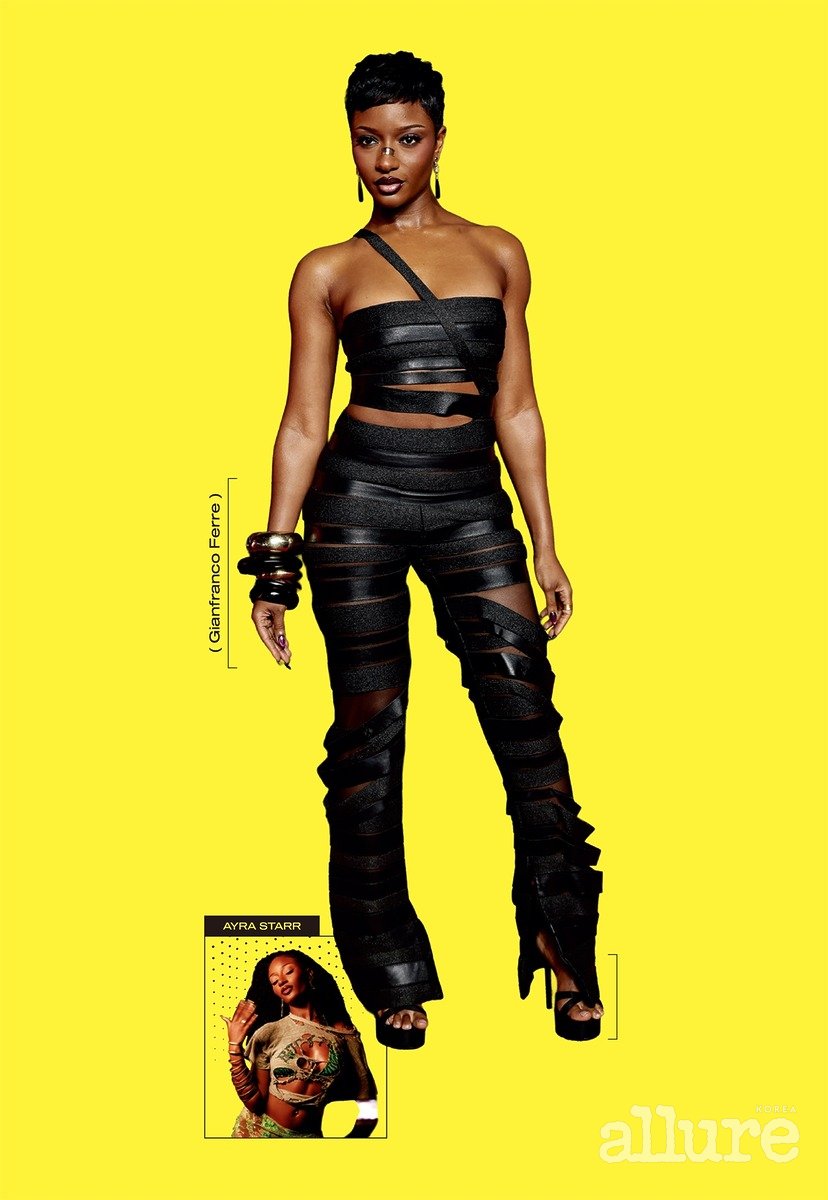 서아프리카를 넘어 세계 팝의 최전선에 우뚝 선 2002년생 싱어송라이터 아이라 스타(Ayra Starr)의 주무기는 아프로비츠를 기반으로 한 독창적인 사운드와 미감이다. 나이지리아 얼터너티브 서브컬처를 Y2K 감성으로 재해석한 그의 음악과 스타일은 국경을 초월해 전 세계 젠지의 시선을 가장 먼저 사로잡는다. 영어와 피진어, 요루바어를 오가며 흘러나오는 리듬 위에서 춤선과 함께 드러나는 보디라인은 단순한 노출이 아닌, 강렬한 자기주도적 메시지를 전한다. “옷을 입을 때 남의 시선을 기준으로 두지 않아요. 움직일 수 없는 옷은 제 옷이 아니죠.” 이 같은 스타의 말처럼, 정지된 사진보다 위트 있는 쇼츠에 열광하는 젠지에게 패션은 몸과 리듬 속에서 매 순간 살아 움직이는 이유 그 자체다. 스타의 패션이 세련된 이유도 바로 여기에 있다. 노출을 바라보는 시선을 교묘히 비켜가며, ‘보여지는 몸’이 아닌 ‘주도하는 몸’으로 읽히기 때문이다. 매일 똑같은 옷차림에 잠시 지루해졌다면, 나이지리아를 중심으로 퍼져 나가는 아프리카 패션에 눈길을 두고 저절로 흥이 나는 룩과 마주해보자. 사운드처럼 번져가는 이국적인 에너지를 만끽할 수 있을 것이다.