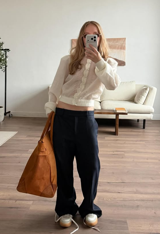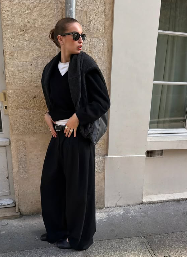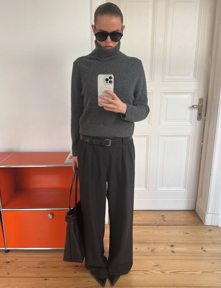 출근 룩이 고민이라면 와이드 팬츠와 니트의 조합을 추천합니다. 블랙, 그레이, 브라운 등 기본 컬러의 와이드 슬랙스와 니트를 깔별로 쟁여두고 돌아가면서 입기만 해도 일주일 출근 룩은 거뜬하죠. 흰 티셔츠와 브이넥 니트를 레이어드하거나 그레이 터틀넥에 와이드 슬랙스를 매치해 보세요. 이때 핀턱이 깊게 잡힌 팬츠를 선택하는 것이 팁입니다. 와이드한 벨트를 더하면 모던하고 포멀한 룩을 완성할 수 있죠.