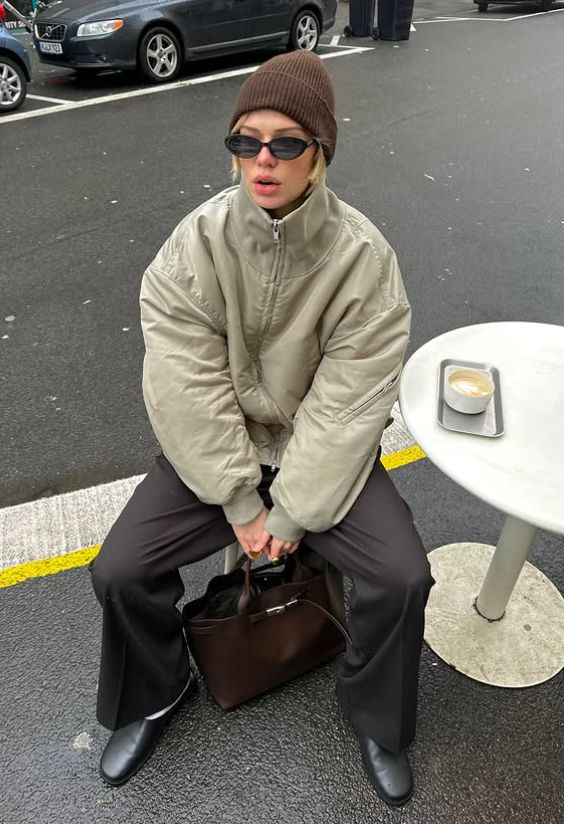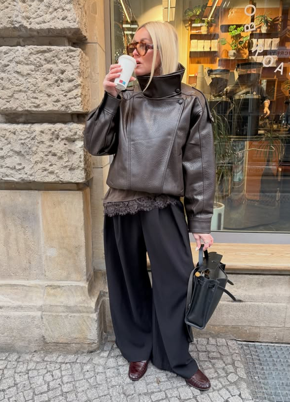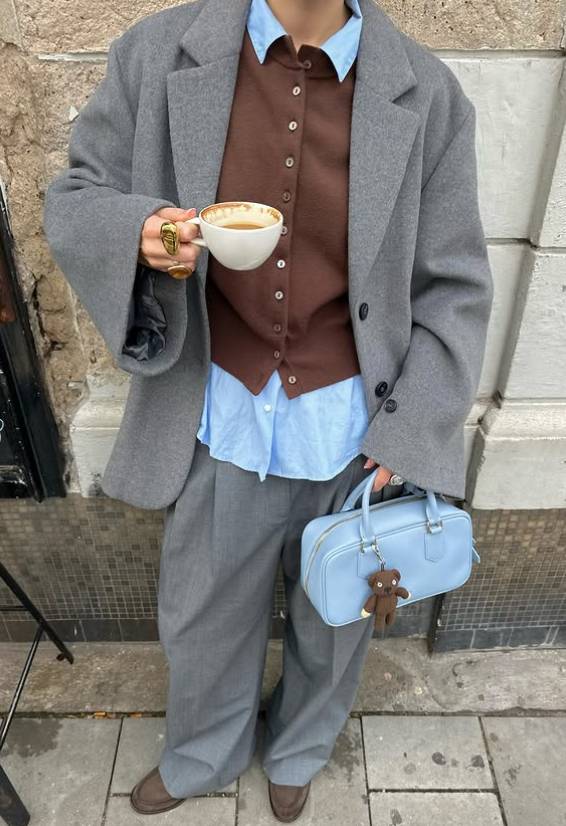 와이드 팬츠를 좀 더 포멀하고 단정하게 입고 싶다면 블레이저 같은 재킷이 좋은 답이 되어줄 거예요. 재킷과 팬츠의 컬러를 톤온톤으로 맞춘다면 셋업처럼 연출할 수 있고요! 그레이 와이드 팬츠에는 같은 톤의 박시한 블레이저를 입어보세요. 여기에 하늘색 같은 컬러 포인트를 더하면 경쾌한 느낌을 더할 수 있죠. 더 시크하고 격식 있는 무드를 원한다면 브라운 팬츠에 베이지나 카멜 톤의 각 잡힌 테일러드 재킷을 입어보세요!