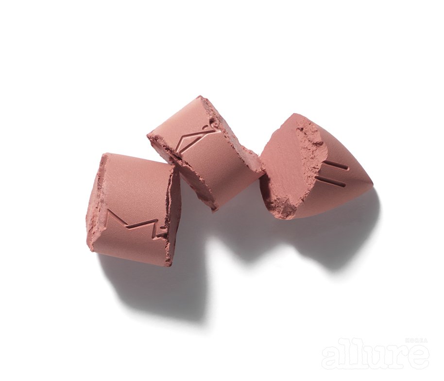 맥의 파우더 키스 헤이지 매트 립스틱 #비 마이 브라이즈메이드 키스 후 립스틱이 스머징된 듯, 자연스러운 블러 효과로 입술 주름을 메운다. 3.5g 4만2천원.