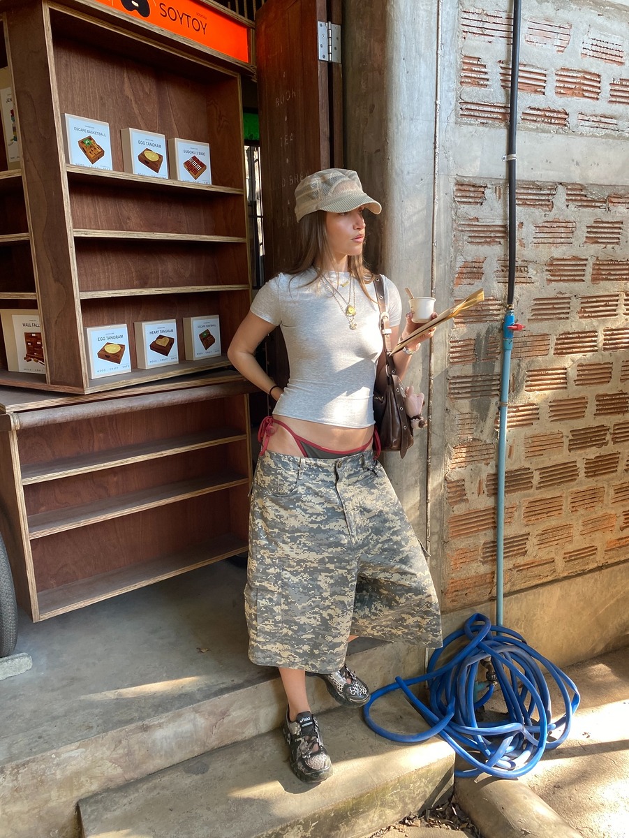 새깅의 진짜 맛을 살리고 싶다면 휴양지 룩에서 도전해 보세요. 크롭 티셔츠와 골반까지 내려 입은 버뮤다팬츠 안에 비키니 브리프 끈을 의도적으로 보이게 입는 거죠. 자칫 밋밋할 수 있는 패션에 얇은 수영복 끈으로 포인트를 더해줄 뿐만 아니라, 바로 수영장이나 바다로 뛰어들 수 있는 준비를 끝낼 수 있답니다.