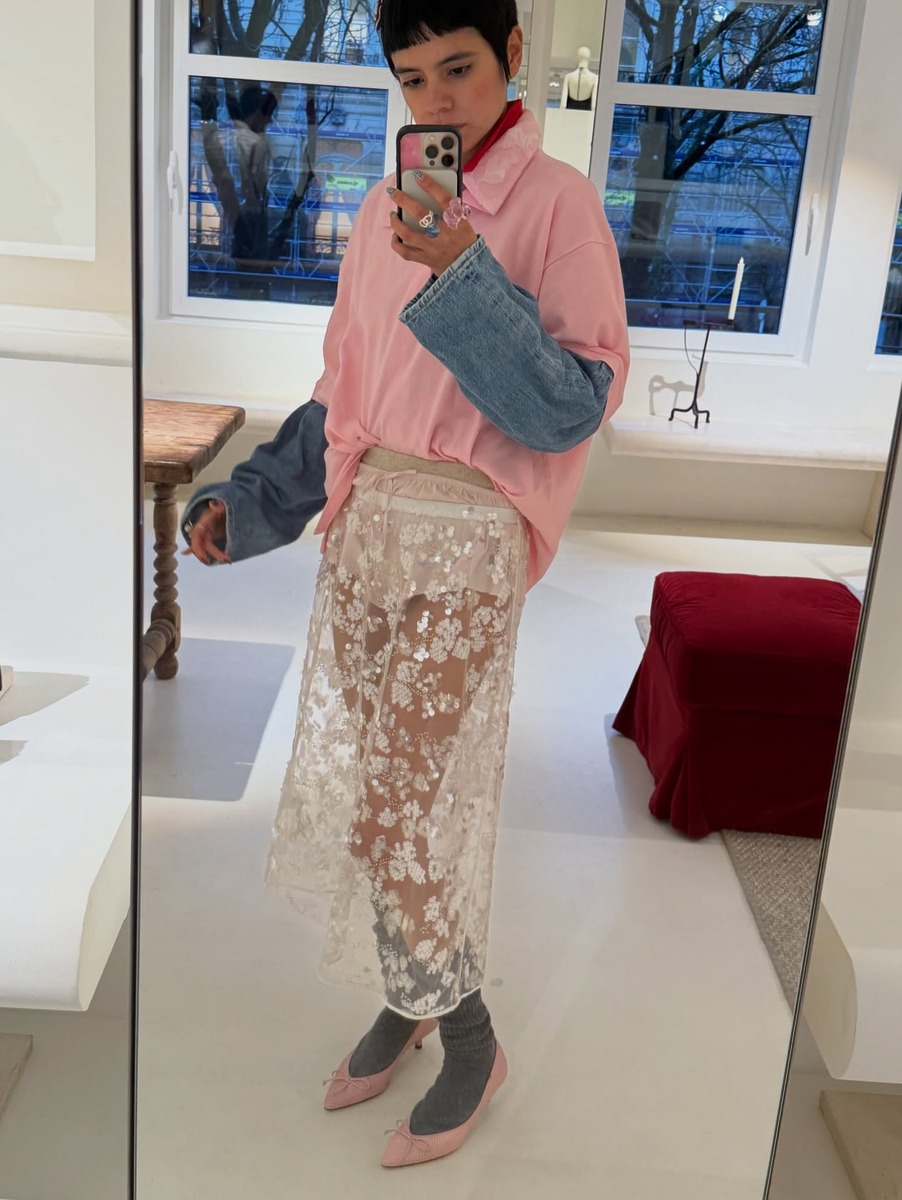 새깅 패션을 페미닌하면서 데일리한 룩에도 적용해 볼 수 있어요. 패션 인플루언서 Lorena Chavez는 새깅을 즐기는 것으로 유명한데, 언더웨어를 선택할 땐 리본이나 레이스 등 러블리한 무드가 한 스푼 들어간 아이템을 선택하는 편이죠. 마치 잠옷 같은 바스락한 브리프 쇼츠를 바지 위로 보이게 입어 소녀스럽게 연출하거나 시스루 시퀸 스커트 안에 연핑크 컬러의 브리프 쇼츠를 잘 보이도록 입는 센스를 발휘합니다.