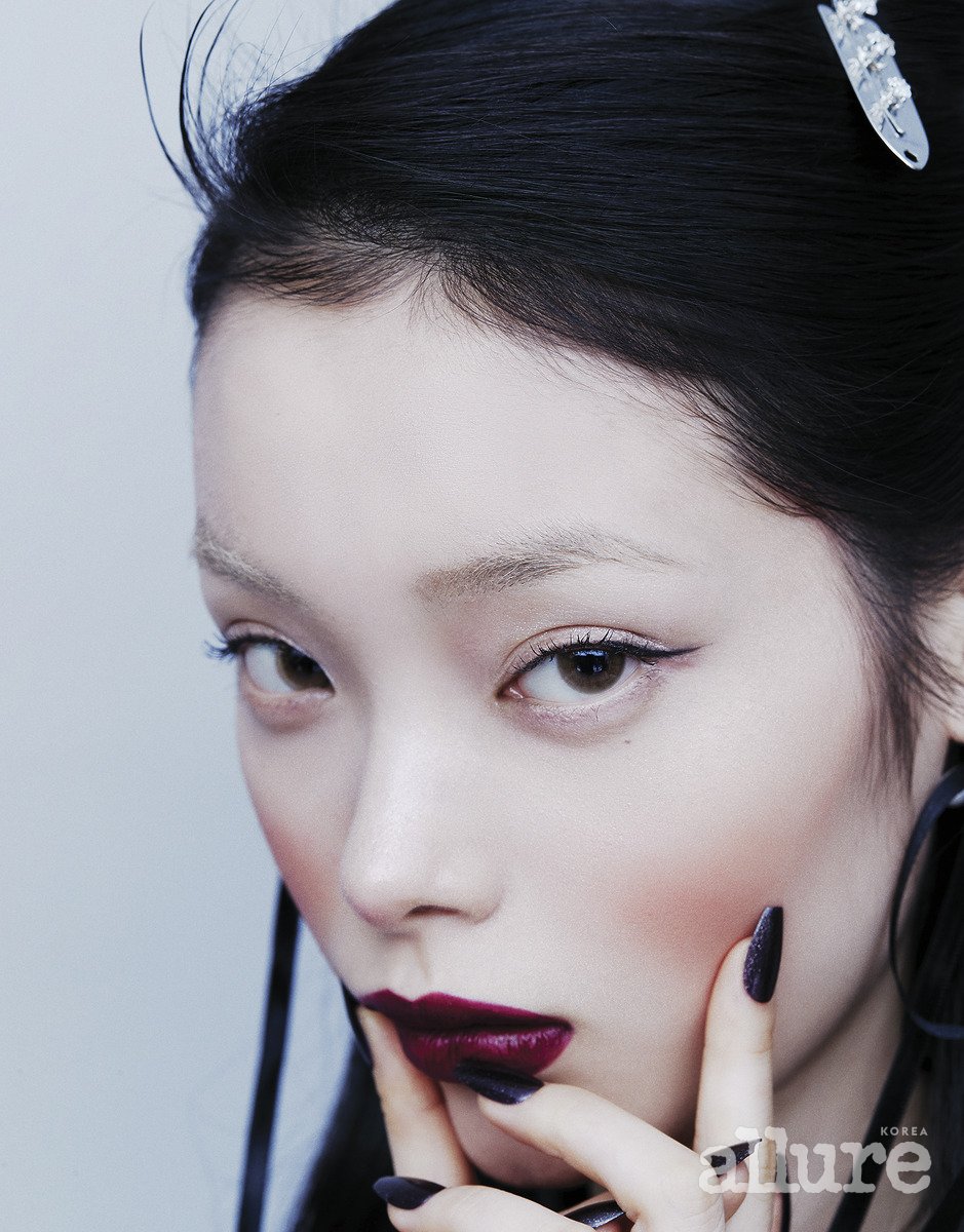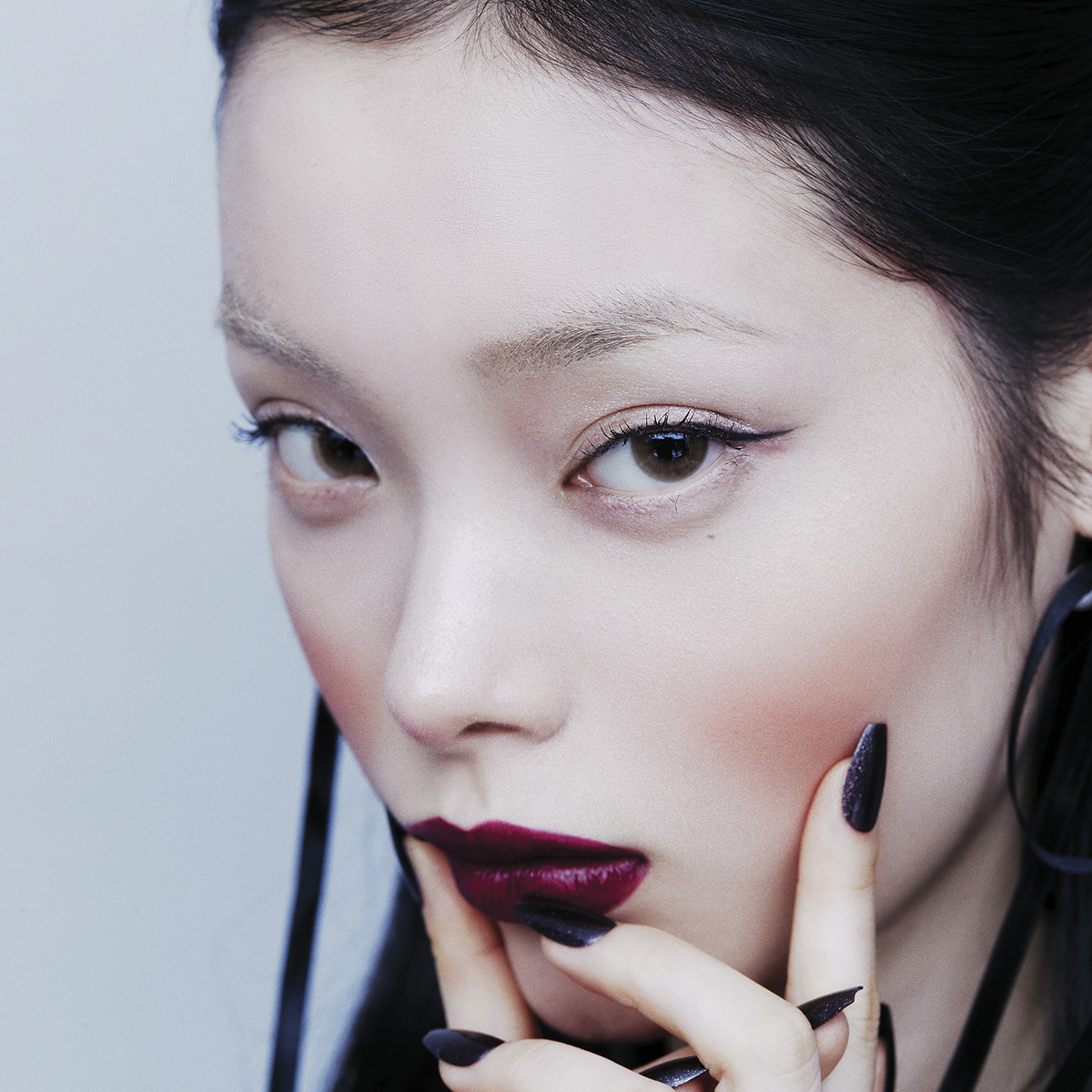 색채를 덜어낸 눈매와 거칠게 상기된 뺨으로 서사를 알 수 없는 묘한 긴장감을 불어넣는 것이 팁. 온기를 모두 거둬낸 창백한 피부와 검붉은 장미처럼 피어난 립 메이크업의 극적인 대비를 통해 순수함과 위험함 사이를 아슬아슬하게 줄타기하는 소녀의 이중성을 표현했다.