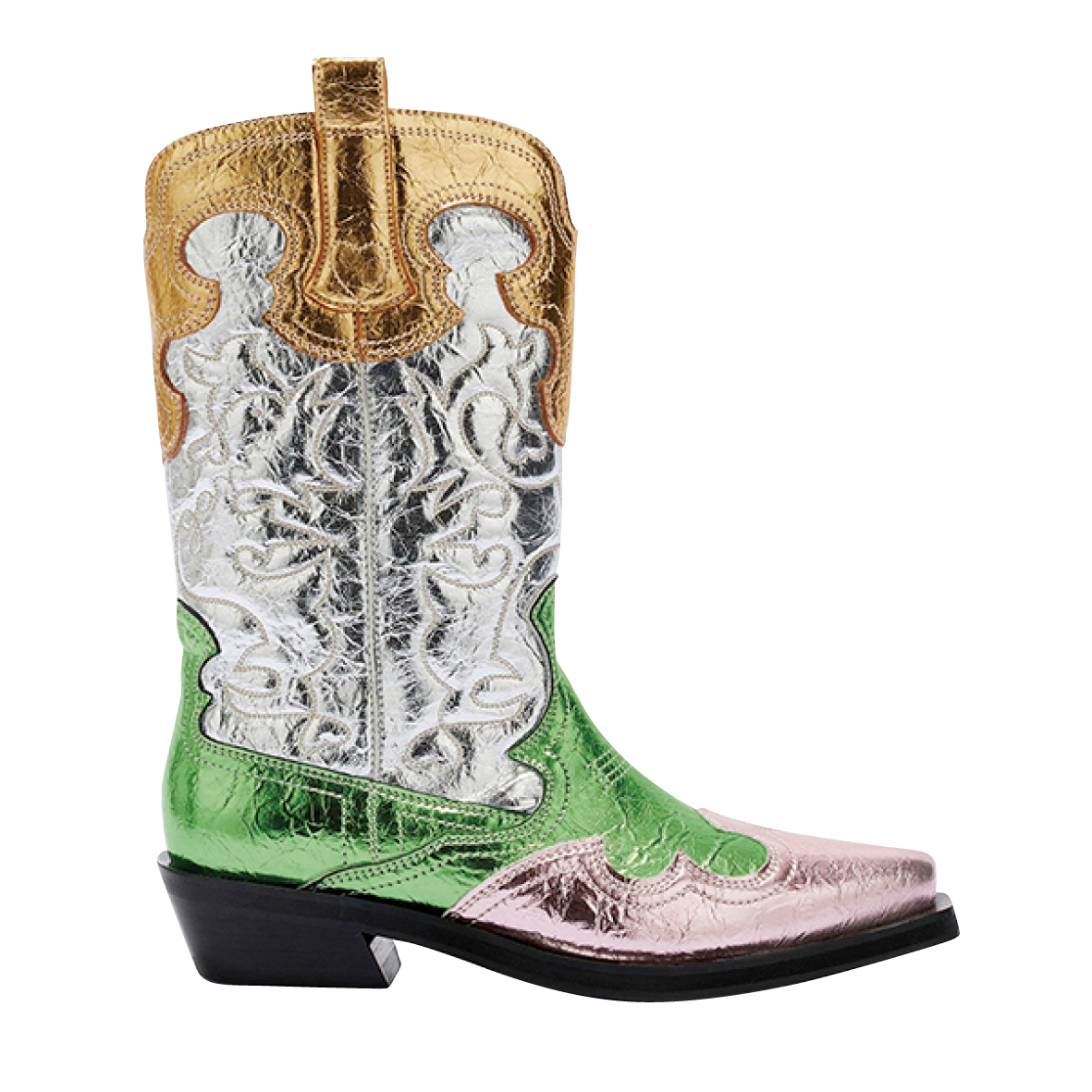 재활용 폴리에스터 소재를 활용한 컬러블록 웨스턴 부츠는 89만원 가니(Ganni).