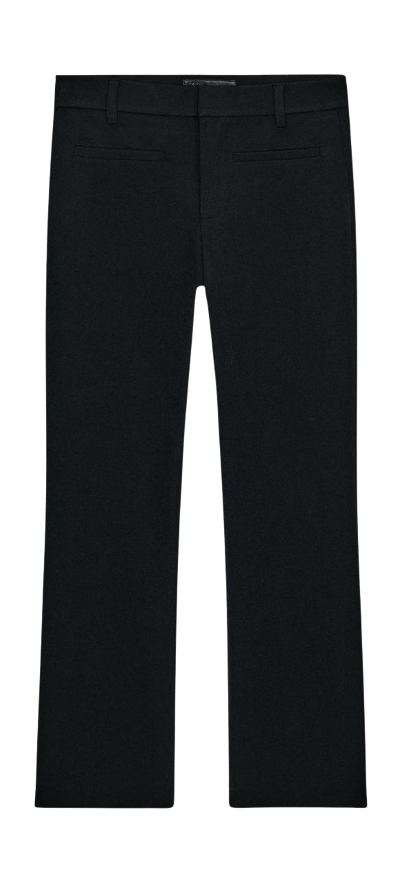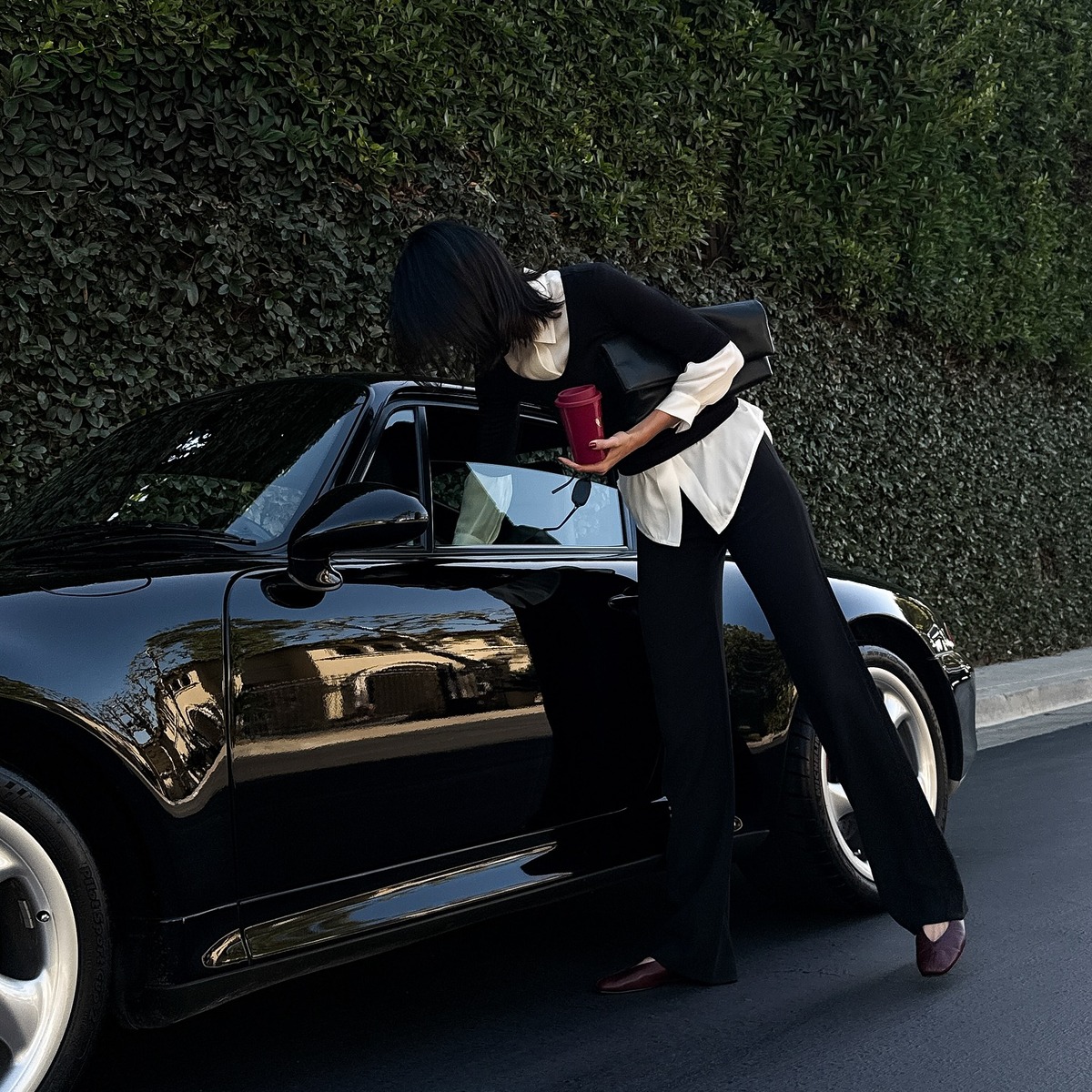 슬랙스 룩의 정석을 보여준 켄달 제너. 블랙 슬랙스와 화이트 셔츠라는 기본 조합에 슬림한 7부 니트를 매치해 우아함을 강조했는데요. 클러치 백과 버건디 플랫슈즈로 깔끔하게 마무리해 더 고급스러워 보입니다.
