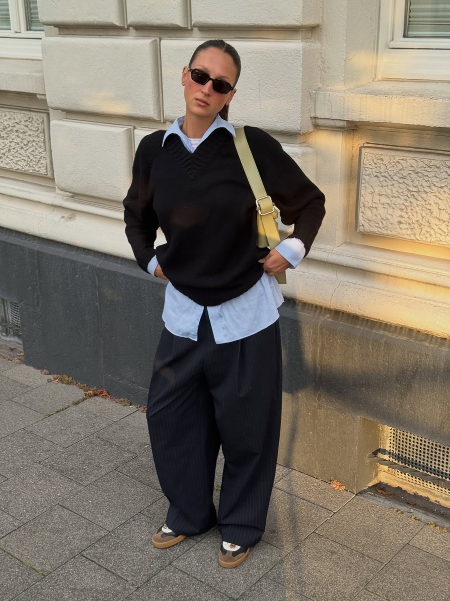 기본 티셔츠나 셔츠에 브이넥 니트를 레이어드하고 슬랙스를 매치하는 것은 실패할 걱정 없는 출근룩의 클래식이죠. 베이직한 아이템의 조합인 만큼 슬랙스의 실루엣을 여유롭게 가져가 세련된 인상을 주는 것이 좋습니다.