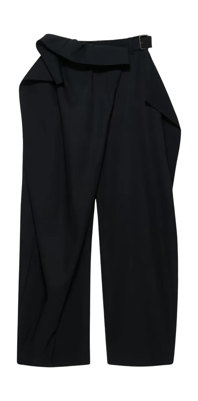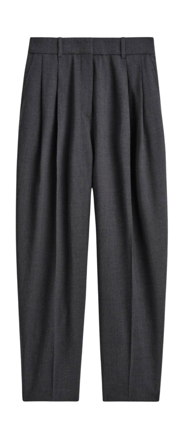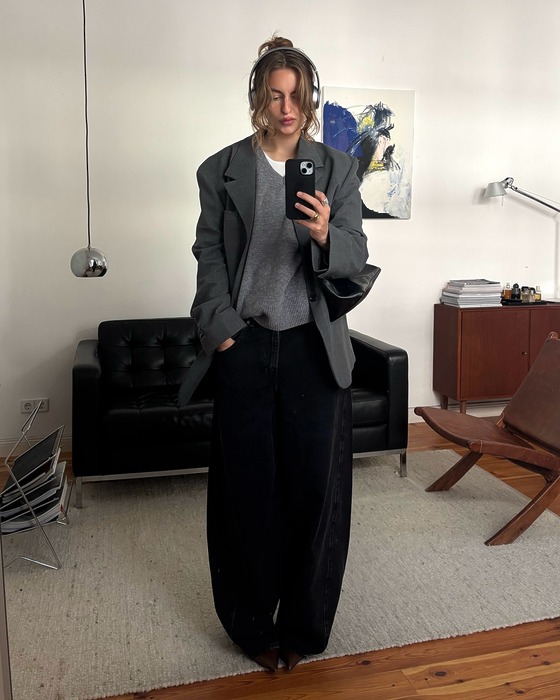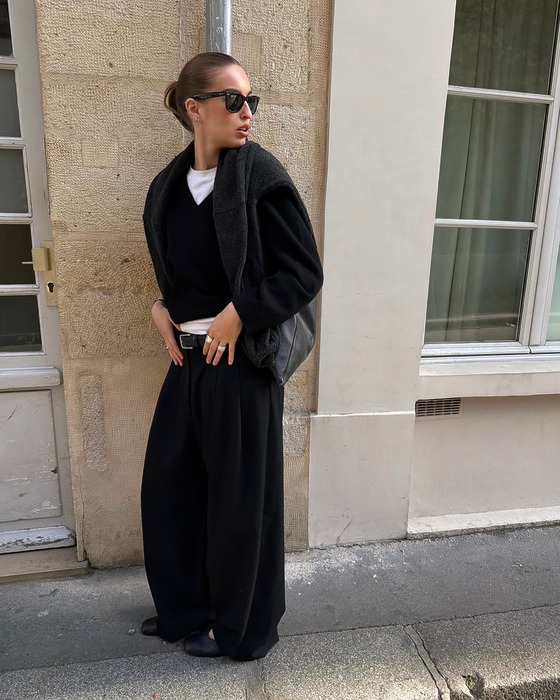 와이드 슬랙스는 별다른 스타일링 없이도 룩에 세련된 분위기를 더해주는 고마운 아이템. 여기에 블랙 롱 코트까지 더해지면 과하지 않으면서도 드라마틱한 룩이 완성됩니다. 오피스룩을 연출할 때는 로퍼나 앵클부츠로 마무리해 단정하게 마무리해 주세요.