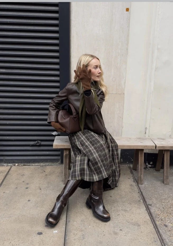 또한 브라운 부츠는 올해의 핵심 아이템인 스커트와도 환상의 궁합을 자랑합니다. 클래식한 체크 패턴의 롱 스커트에 매치하면 군더더기 없이 깔끔한 데일리 룩이 완성되죠. 이때 전체적인 의상 컬러를 브라운 계열로 맞춘 톤온톤 룩을 연출해 보세요. 평일 출근부터 주말 나들이까지 모두 소화할 수 있는 전천후 스타일링이 완성됩니다.