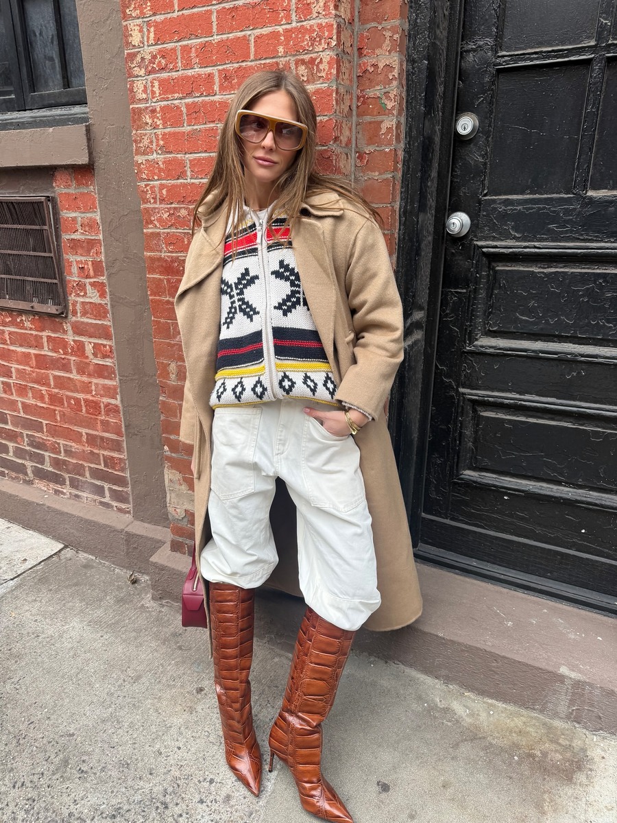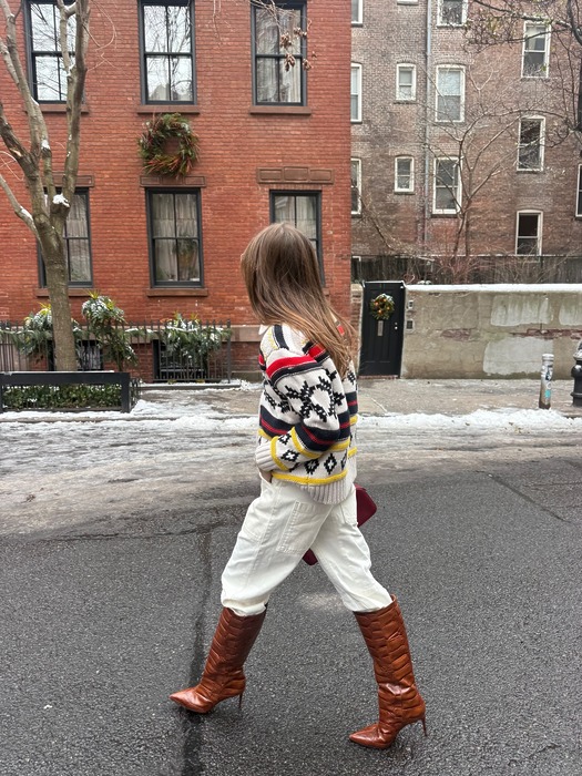 팬츠와의 조합 역시 빼놓을 수 없습니다. 데님이나 화이트 팬츠에 브라운 부츠를 더하면 클래식하면서도 세련된 인상을 줍니다. 여기에 패턴 스웨터를 곁들이면 한결 내추럴하고 편안한 분위기가 살아나죠. 만약 키가 작아 고민이라면 바짓단을 부츠 안으로 넣어보세요. 시선이 끊기지 않아 다리가 훨씬 길어 보일 거예요.