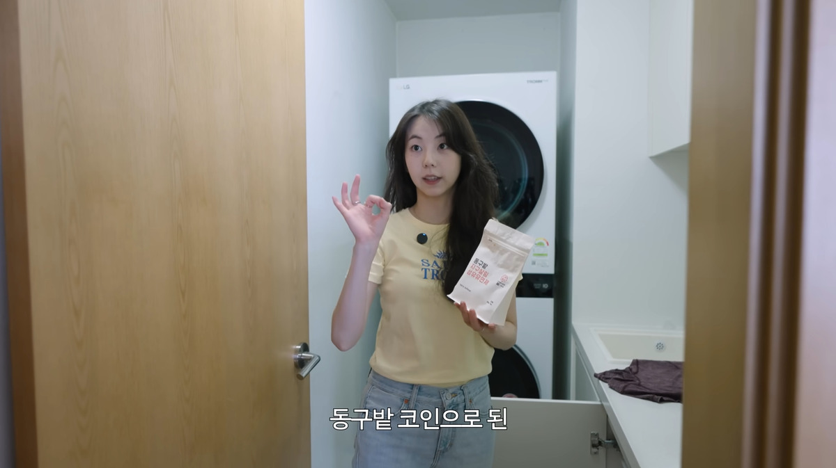 ‘옷잘알’답게 다양한 세탁 세제를 구비하고 있는 소희. 그녀는 옷 뿐 아니라 피부, 그리고 환경에도 좋은 제품을 추천해주었습니다. 소희가 가장 먼저 소개한 제품은 동구밭에서 제작한 원형 태블릿 형태의 섬유유연제인데요, 현재는 섬유유연제는 단종되고 세탁 세제만 출시되고 있어요. 액체로 된 세제들은 대부분 플라스틱 케이스를 사용하는데요, 때문에 플라스틱 재활용 이슈로부터 자유로울 수 없죠. 이에 대한 대안으로 나온 것이 바로 플라스틱 사용을 줄일 수 있는 태블릿 세제 입니다. 세제 통에 넣을 때 조각 내어서 넣으면 더 좋아요.